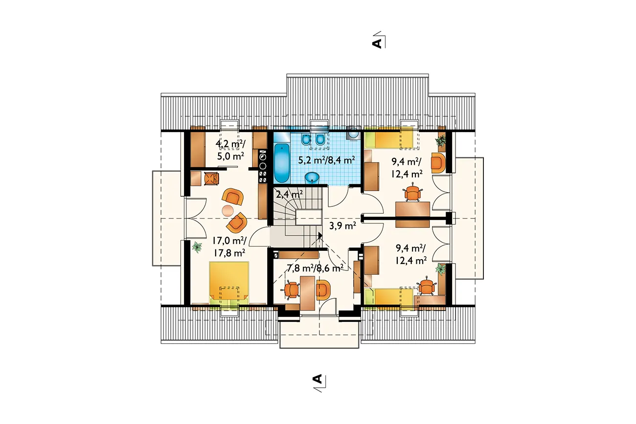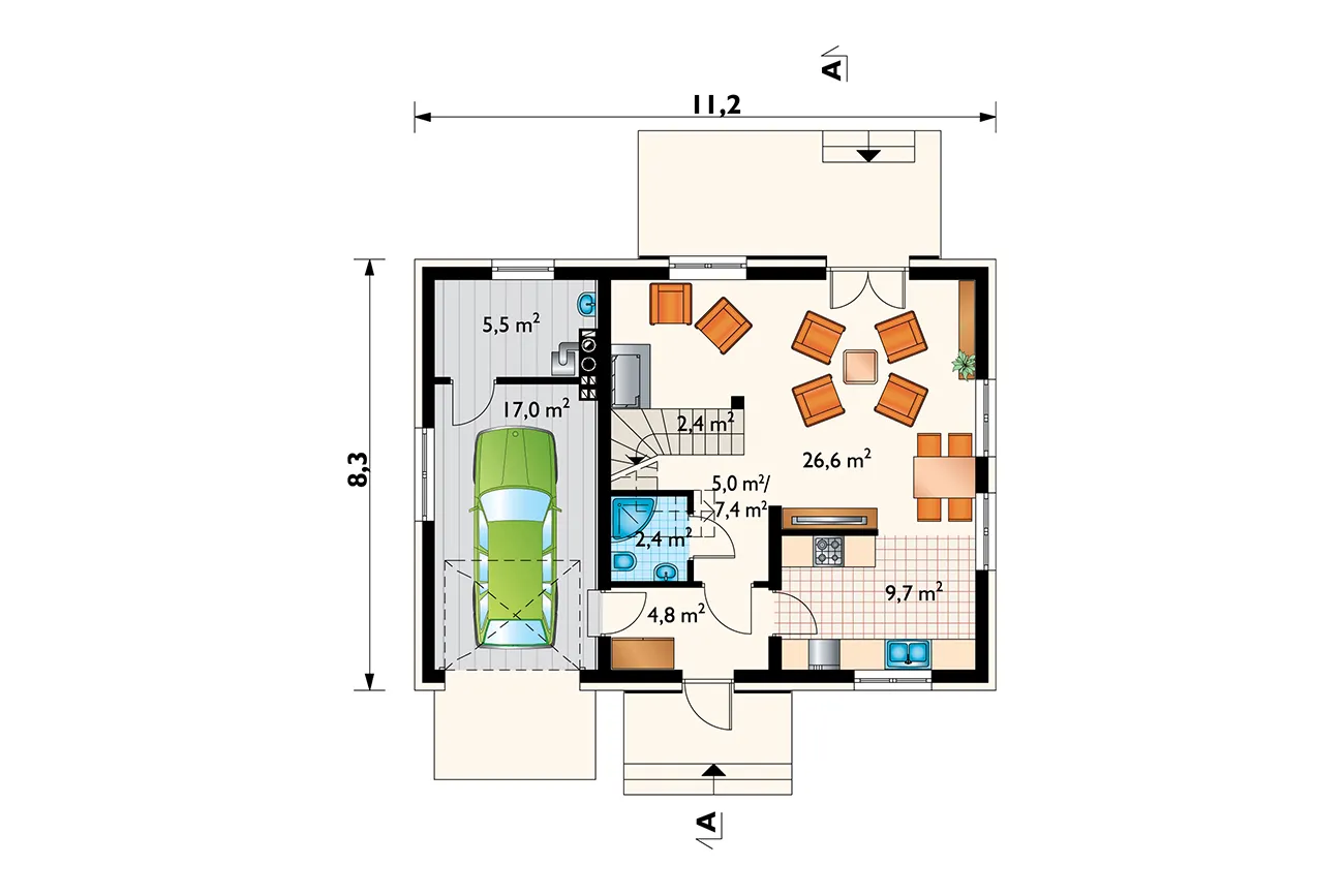 Семейство домов Tarot предлагает привлекательный выбор простых домов с функциональными чердаками и встроенными гаражами, площадью от 100 до 145 м². Все они отличаются компактной прямоугольной планировкой и общей экономичной двускатной крышей с коньком, параллельным подъездной дорожке, над жилыми и хозяйственными помещениями. Дом Tarot Sto — самый маленький в семействе и, следовательно, единственный без дополнительной комнаты, примыкающей к гостиной. Подобно Zofia Prima, схожему по размеру, силуэту и функциональному назначению, он предлагает эффектную гостиную с открытой лестницей, но кухня может быть отделена от гостиной перегородкой. Простые балконы, отсутствие выступа, мансардное окно, подчеркивающее только фасад дома, и симметрия формы делают дом Tarot Sto компромиссом между наиболее аскетичными и энергоэффективными проектами (такими как функционально схожие Tola и Zoja Neo) и декоративным дизайном Zofia. На чердаке дома Tarot Sto расположены четыре комнаты и большая ванная комната. Главная спальня, оборудованная шкафом, отделена от остальных перепадом уровней.