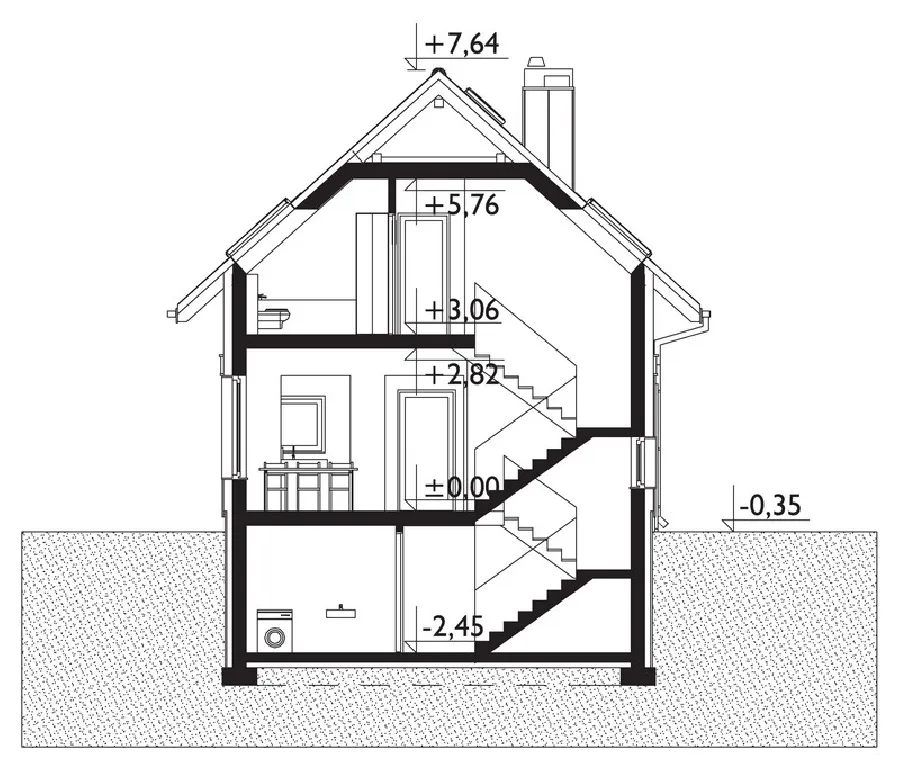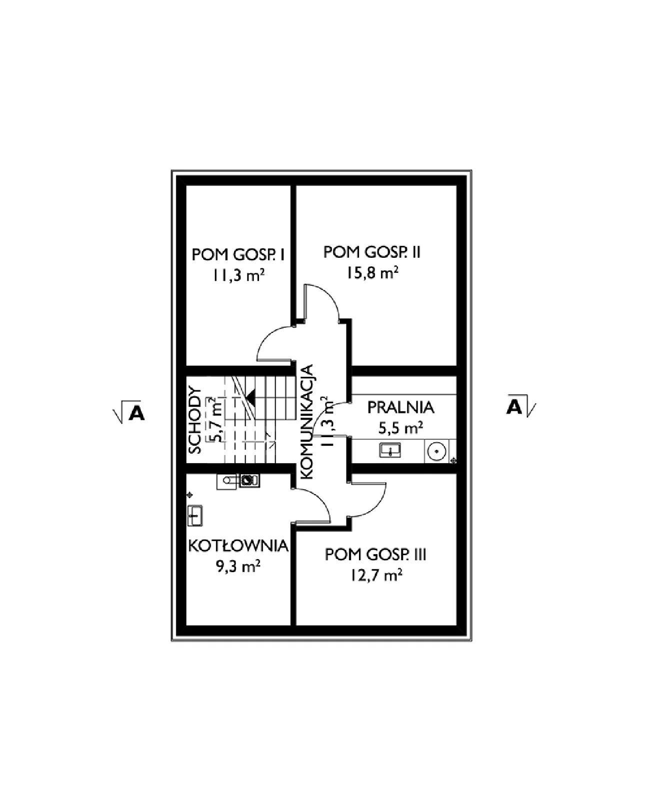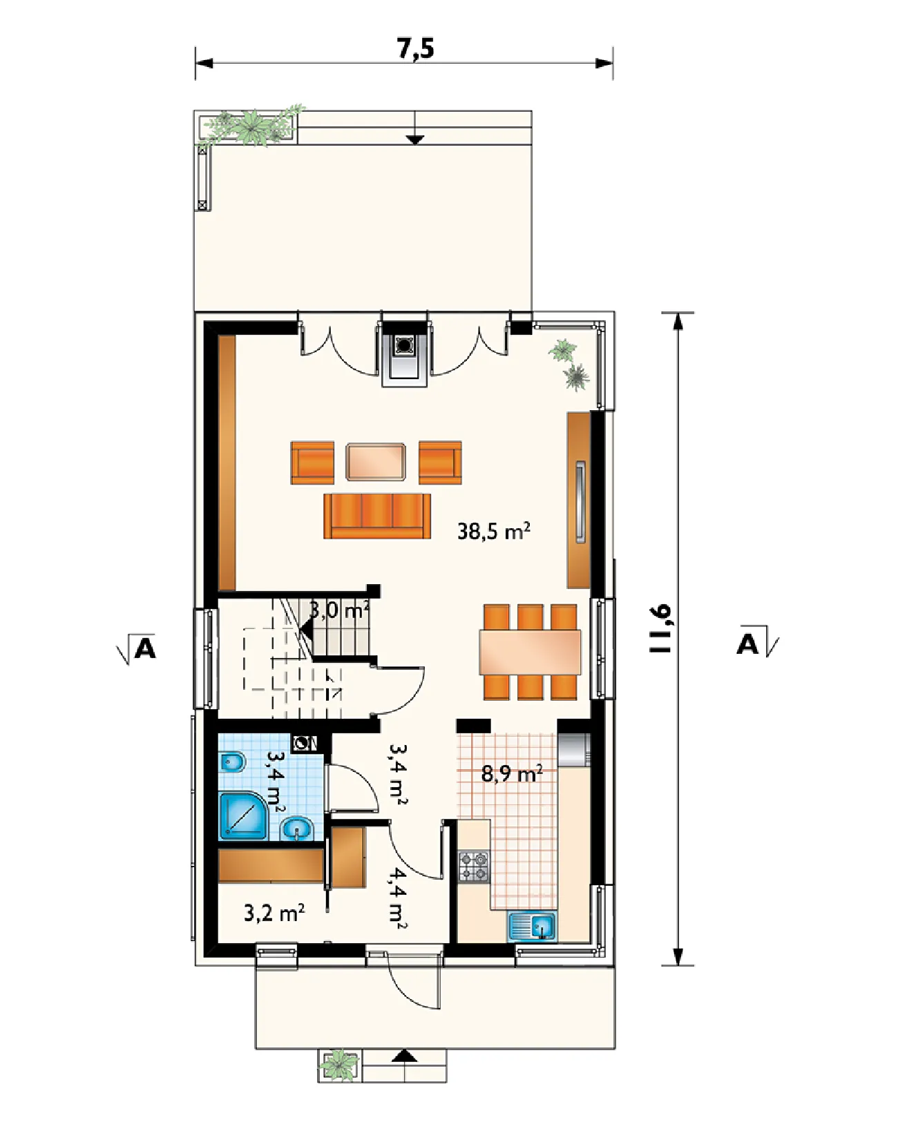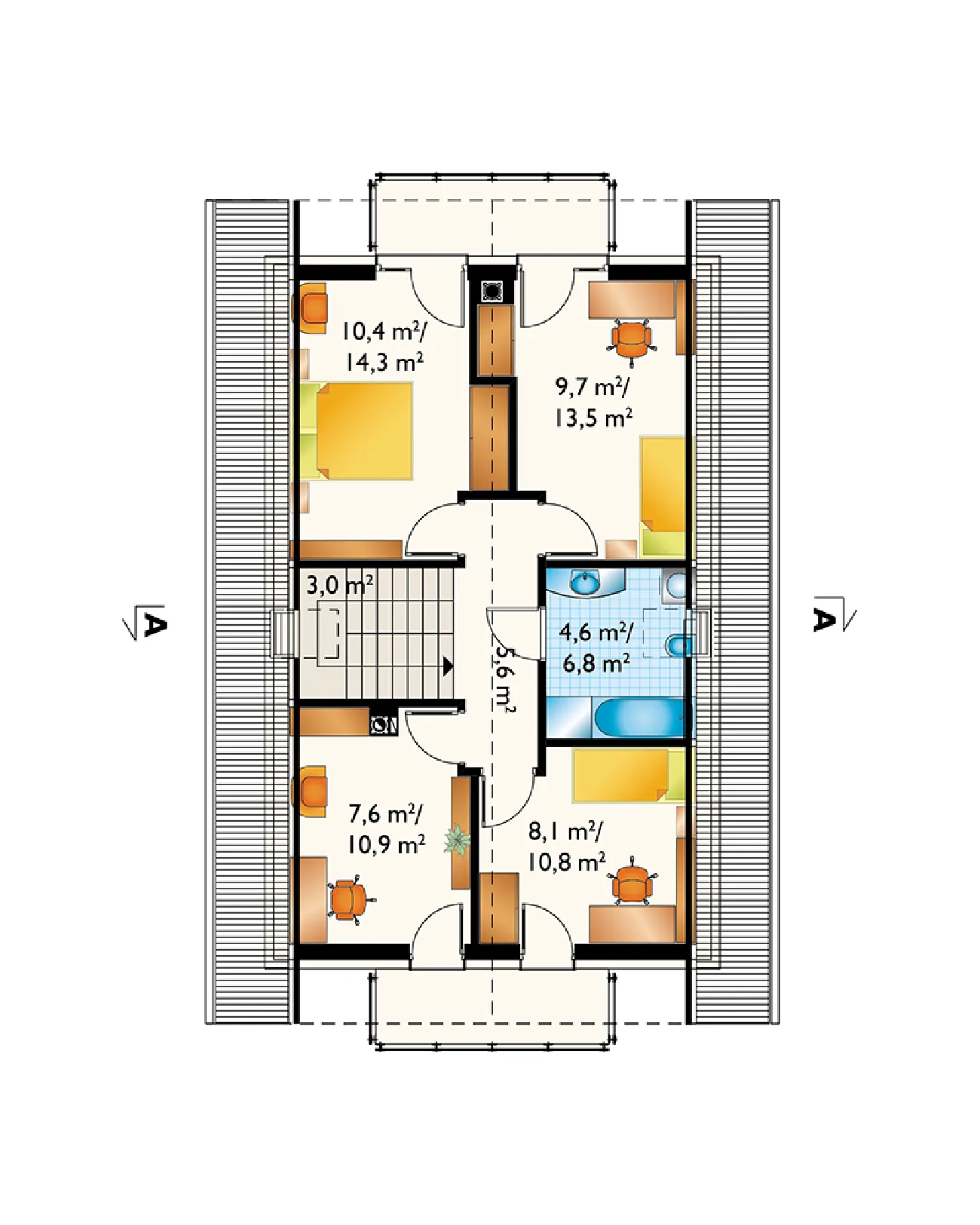 Дома с фронтонными входами часто лучше всего подходят для узких участков. Проект дома «Альфред» — одно из нескольких таких решений от Archeton, с полезной площадью около 110 м², но среди них только «Тосия» имеет полноценный подвал и не имеет гаража. При вытянутых пропорциях участка иногда удобнее строить отдельную хозяйственную постройку — например, за жилым домом. Проект дома «Альфред» еще экономичнее, чем «Тосия». Более узкий и компактный, он лишен входной ниши и декоративного выступа. Фронтонная крыша без мансардных окон имеет всего два мансардных окна. Отделка фасада основана исключительно на расположении угловых окон и геометрических плоскостях различных материалов. Ограниченное пространство на мансарде дома «Альфред», где предлагаются четыре спальни и вторая ванная комната, более чем компенсируется другими этажами. Подвал с котельной, прачечной и двумя подсобными помещениями освобождает место для дополнительных функций и хранения, а очень просторная гостиная открытой планировки создает пространство для семейной и общественной жизни на первом этаже.