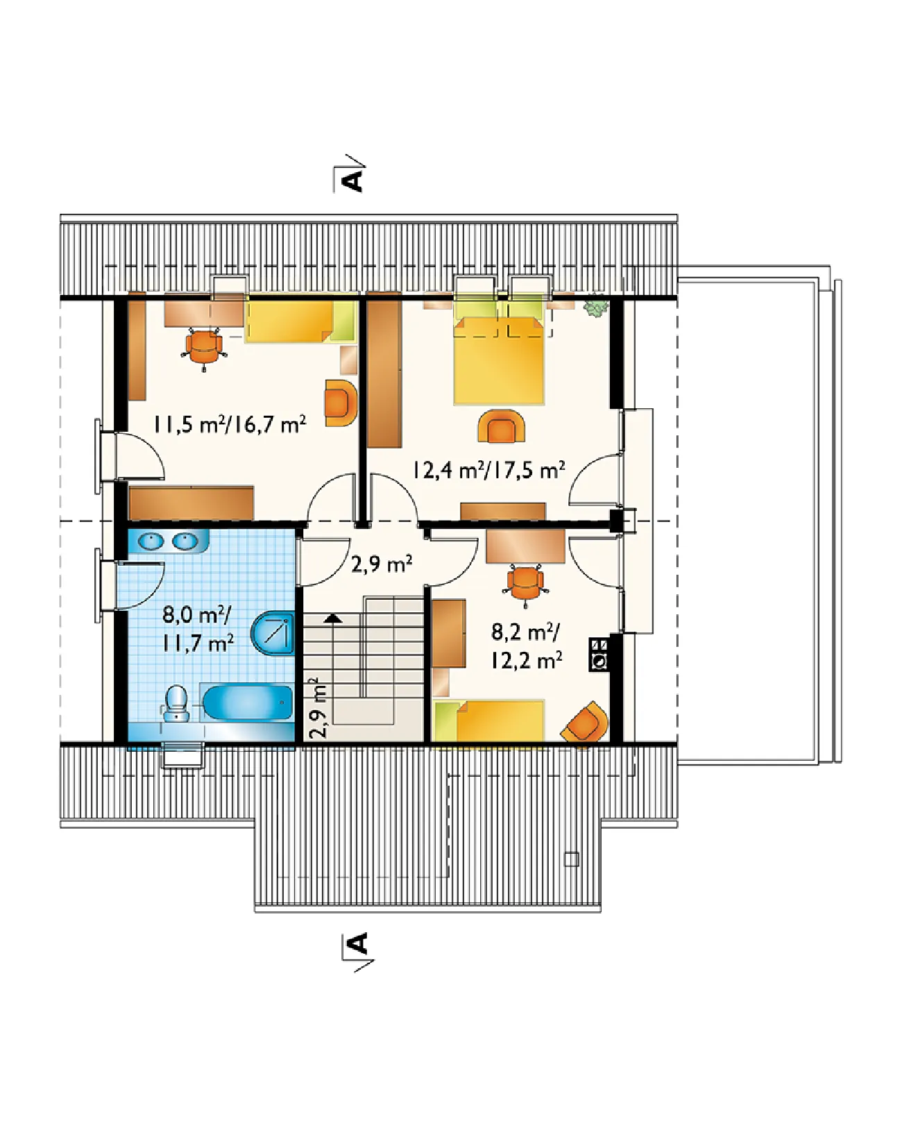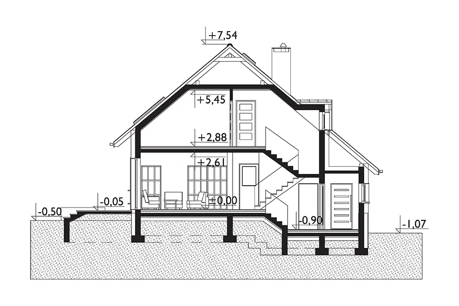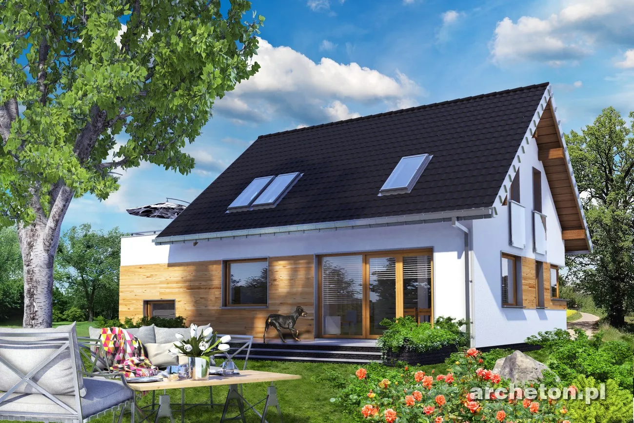 Небольшой дом с функциональным чердаком на слегка наклонном участке предлагает множество различных вариантов. Проект дома Amelia 100 характеризуется компактными пропорциями, с двускатной крышей, параллельной подъездной дорожке, и вестибюлем, выходящим на фасад. Он покрыт аркадой, поддерживаемой колоннами, заниженным карнизом с небольшим треугольным мансардным окном, освещающим лестничную клетку. Рядом с жилой зоной находится гараж с односкатной крышей, который, вместе с входом и котельной, расположен на 90 см ниже уровня первого этажа. Проект дома Amelia 100 — это немного уменьшенная версия Amelia, корпус которой примерно на 1 метр длиннее, а гараж на визуализации не выделяется горизонтальной внешней обшивкой. Проекты из семейства Amelia (и похожие: Krab и Fiona) предлагают различные функциональные и стилистические варианты с дополнительной комнатой на первом этаже. Мансарда с тремя спальнями и красивой ванной комнатой может быть отделана на втором этапе. Силуэт дома «Амелия» — самый простой и энергоэффективный в этой группе: нет выступа в боковой стене (как у «Фионы») и нет балкона (как у «Краб Альфы»). Фасады также более современные: свободной формы, с большими окнами.