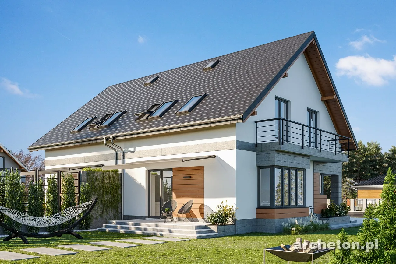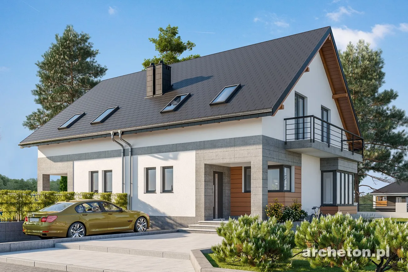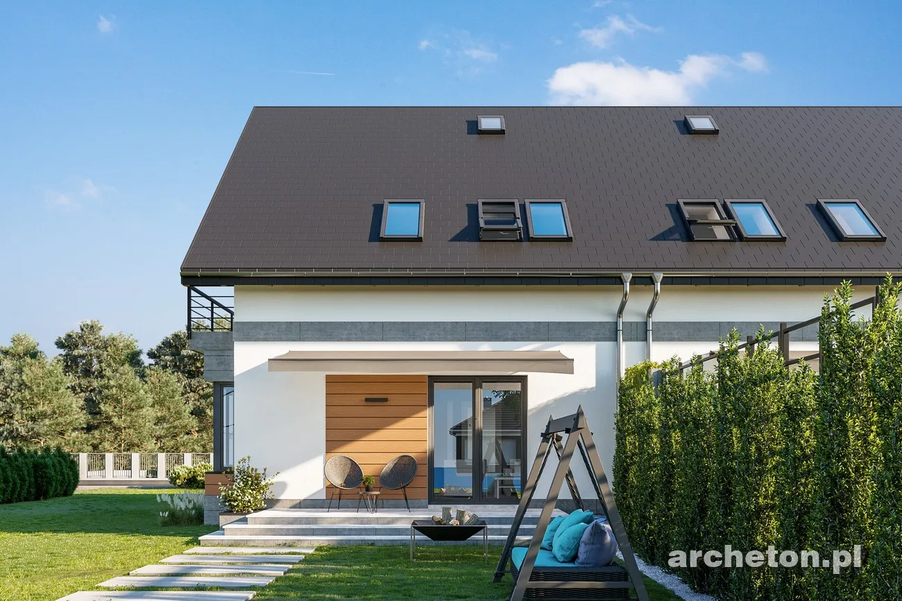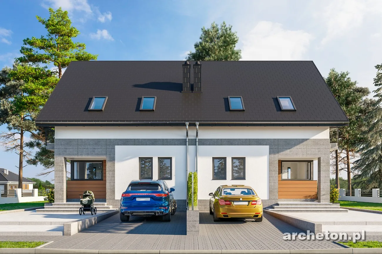 Проект дома Beza Bo Duo — одна из самых простых концепций одноэтажного дома с функциональным чердаком, предназначенного для сблокированной застройки. Как и в случае с немного меньшим по размеру Beza Duo, это обусловлено его небольшой площадью основания, вытянутой планировкой, перпендикулярной подъездной дорожке, и отсутствием гаража. Простая форма имеет экономичную крышу без мансардных окон (место для солнечных батарей!). Он был создан на немного более широкой планировке, чем Beza Duo. При той же длине планировки на первом этаже было создано больше места для семейной жизни, а на чердаке — три более комфортабельные спальни для четырех человек и ванная комната. Сочетание гостиной, кухни и прихожей создает красивый, наполненный светом интерьер. Ярким решением является включение лестницы в гостиную. Вариант Bo отличается просторным коридором с гардеробной. Большая площадь также обусловлена ​​механической вентиляцией, которая освобождает место, занимаемое дымоходами. Выступ столовой, обрамленный стеклом, имеет балкон в фронтонной стене. Это единственное визуальное улучшение, помимо передней ниши. В проекте дома Beza Bo Duo устранена разница в высоте между коридором и первым этажом. Вместо этого, приподнятая входная терраса расположена внутри аркады с угловой колонной.