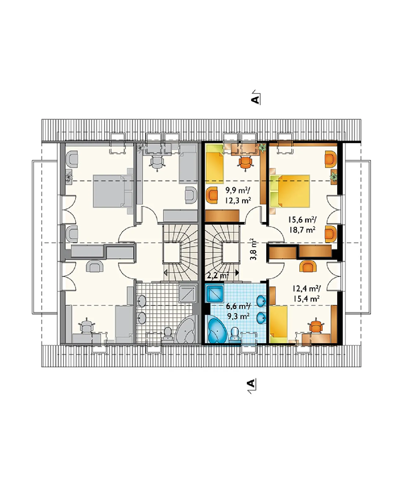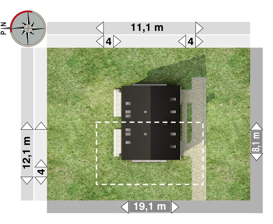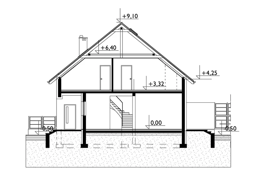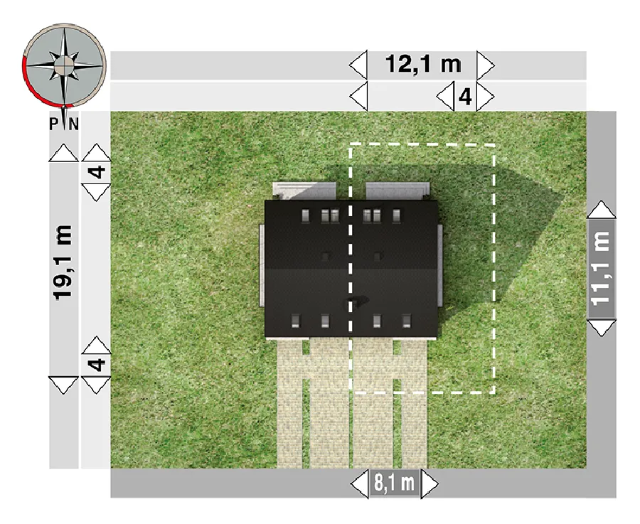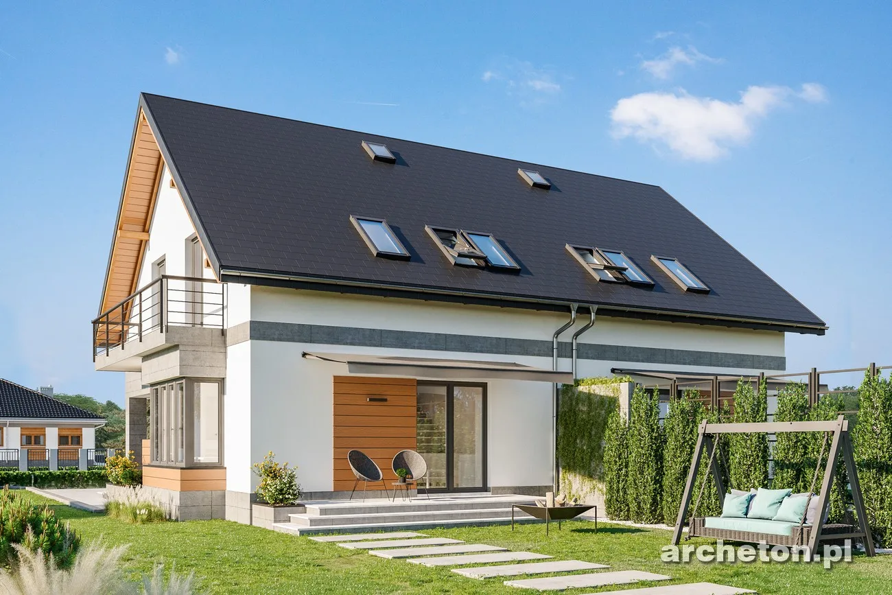 Проект дома Beza Bo Duo — одна из самых простых концепций одноэтажного дома с функциональным чердаком, предназначенного для сблокированной застройки. Как и в случае с немного меньшим по размеру Beza Duo, это обусловлено его небольшой площадью основания, вытянутой планировкой, перпендикулярной подъездной дорожке, и отсутствием гаража. Простая форма имеет экономичную крышу без мансардных окон (место для солнечных батарей!). Он был создан на немного более широкой планировке, чем Beza Duo. При той же длине планировки на первом этаже было создано больше места для семейной жизни, а на чердаке — три более комфортабельные спальни для четырех человек и ванная комната. Сочетание гостиной, кухни и прихожей создает красивый, наполненный светом интерьер. Ярким решением является включение лестницы в гостиную. Вариант Bo отличается просторным коридором с гардеробной. Большая площадь также обусловлена ​​механической вентиляцией, которая освобождает место, занимаемое дымоходами. Выступ столовой, обрамленный стеклом, имеет балкон в фронтонной стене. Это единственное визуальное улучшение, помимо передней ниши. В проекте дома Beza Bo Duo устранена разница в высоте между коридором и первым этажом. Вместо этого, приподнятая входная терраса расположена внутри аркады с угловой колонной.