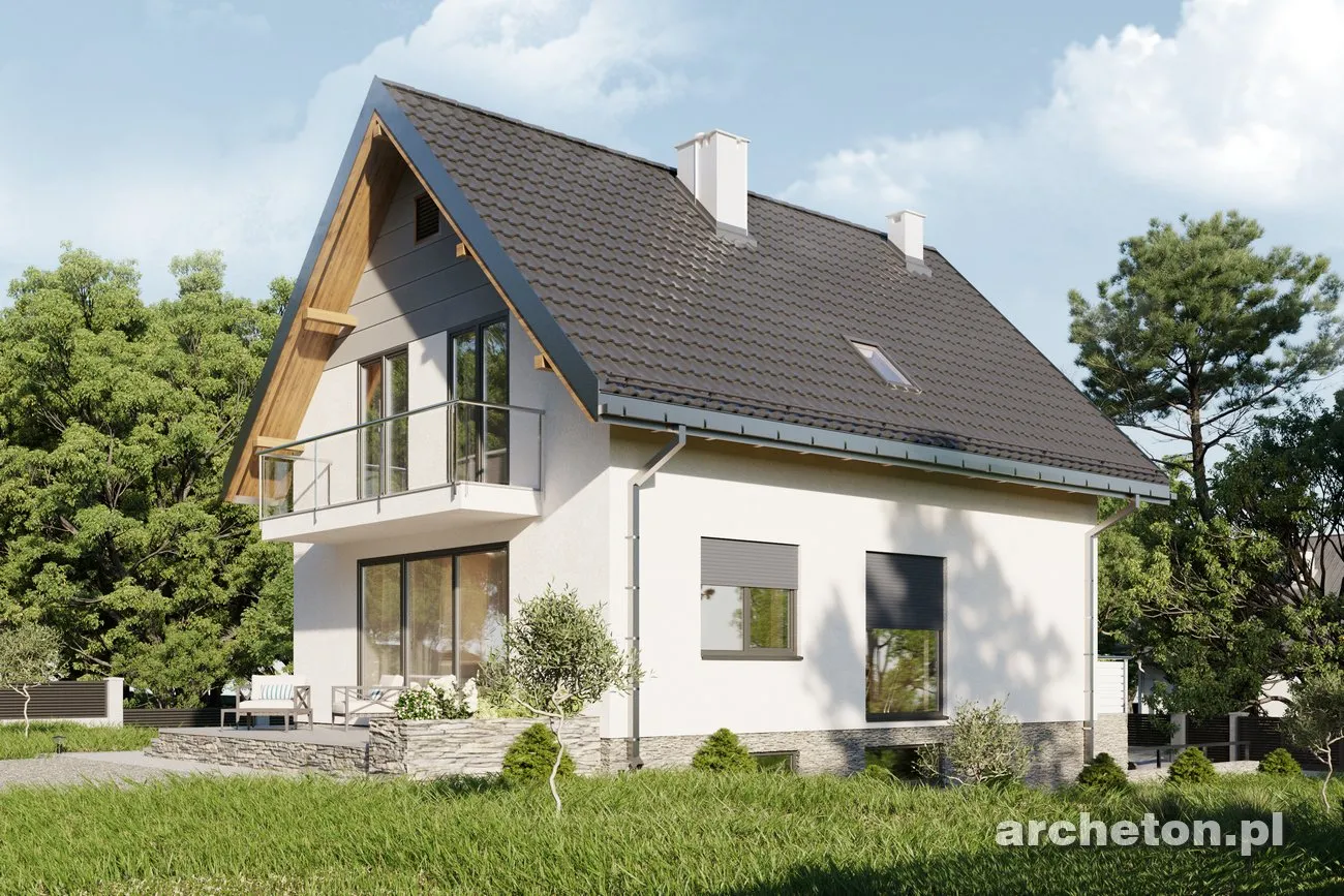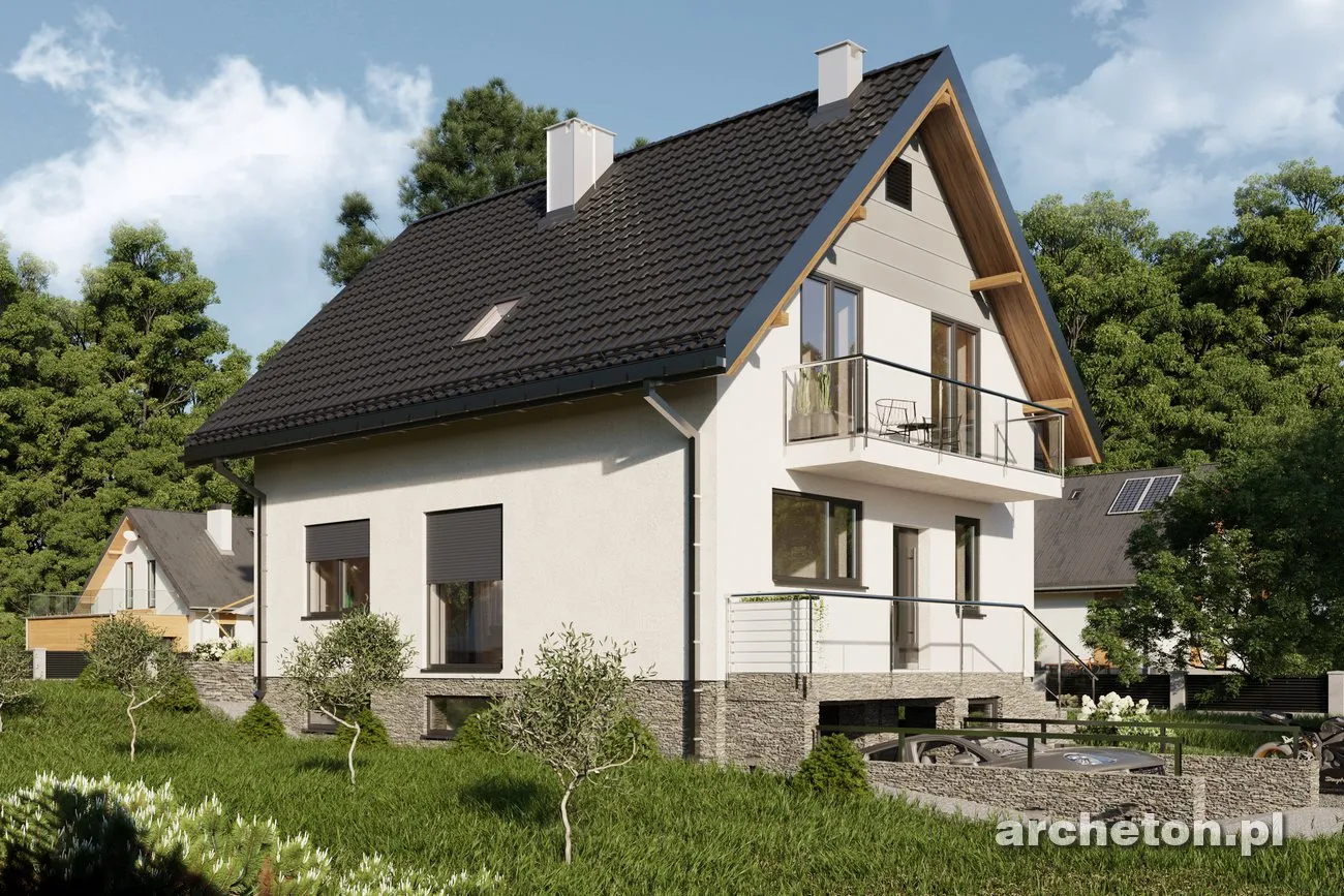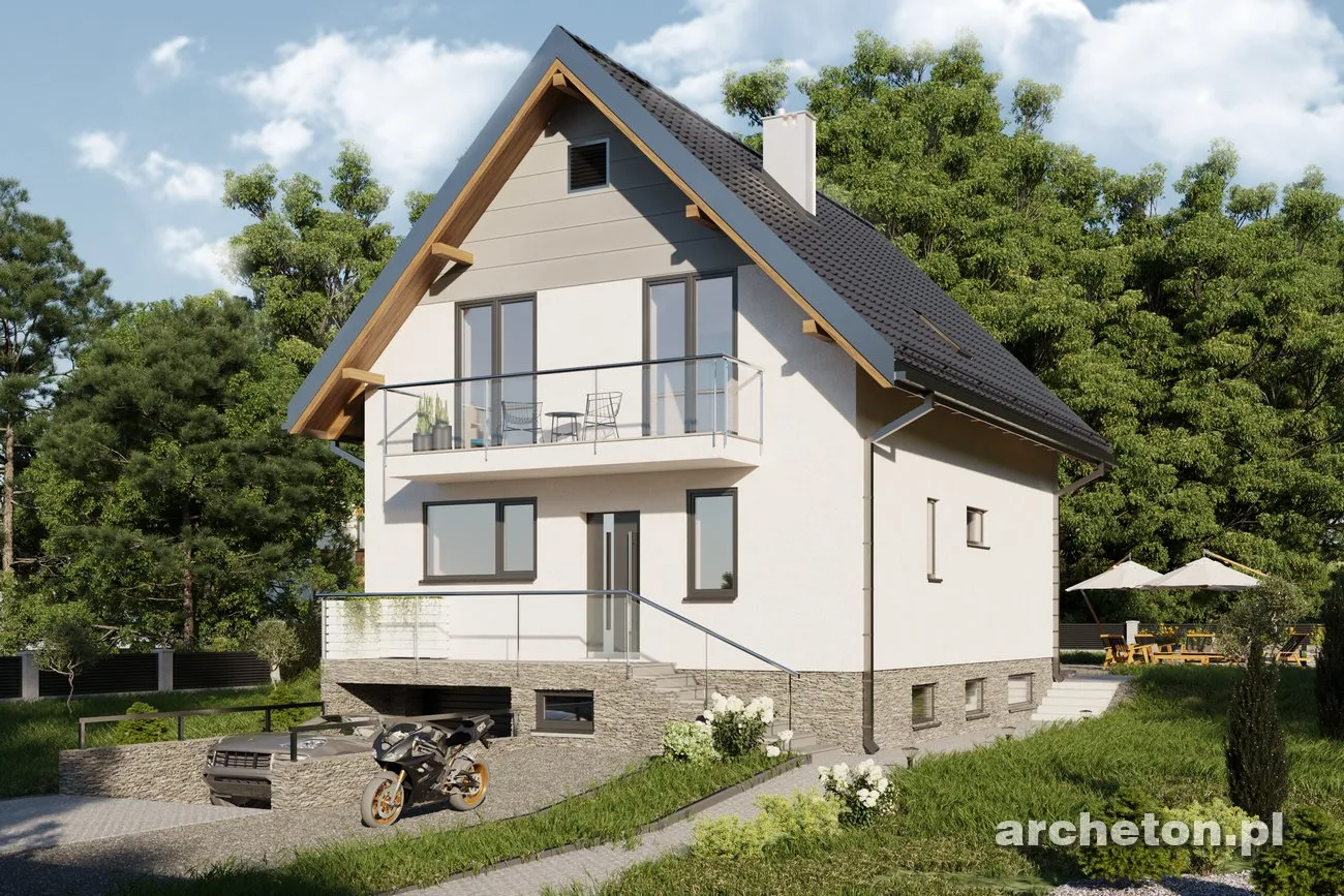 Проект дома «Бедронка», как и немного меньший по размеру «Корал», является одним из немногих проектов небольших домов с функциональным чердаком, предназначенных для узкого участка, предлагая полноценный подвал с гаражом. Фасад обоих проектов обращен к въезду на участок с двускатной крышей. Имея немного более широкую и короткую планировку, чем «Корал», «Бедронка» обладает той же функциональной программой, но более открытой жилой зоной на первом этаже и более компактной формой, без ниш или арок. Это позволяет разместить на чердаке еще одну спальню. Чердак освещается традиционным и экономичным способом – без мансардных окон, в основном через большие окна в фронтонных стенах. Проект дома «Бедронка» идеально подходит для участков с уклоном в сторону подъездной дороги. Полноценный подвал будет более доступным по цене, а терраса, открытая современными большими балконными окнами, удобно соединяет гостиную и сад без существенной разницы уровней. Балконы, закрывающие остекление и входную дверь, являются единственными вариациями в простой форме «Бедронки».