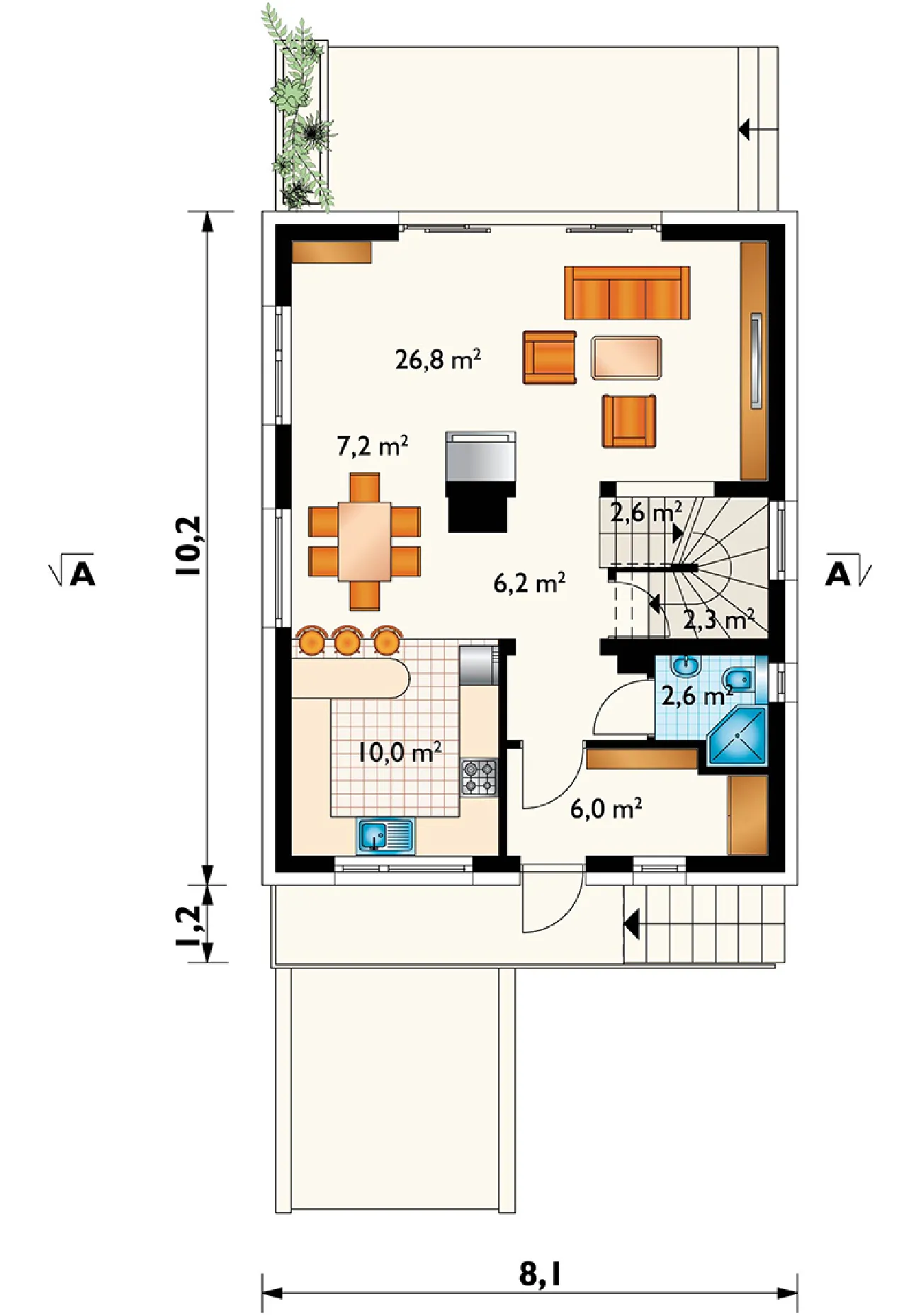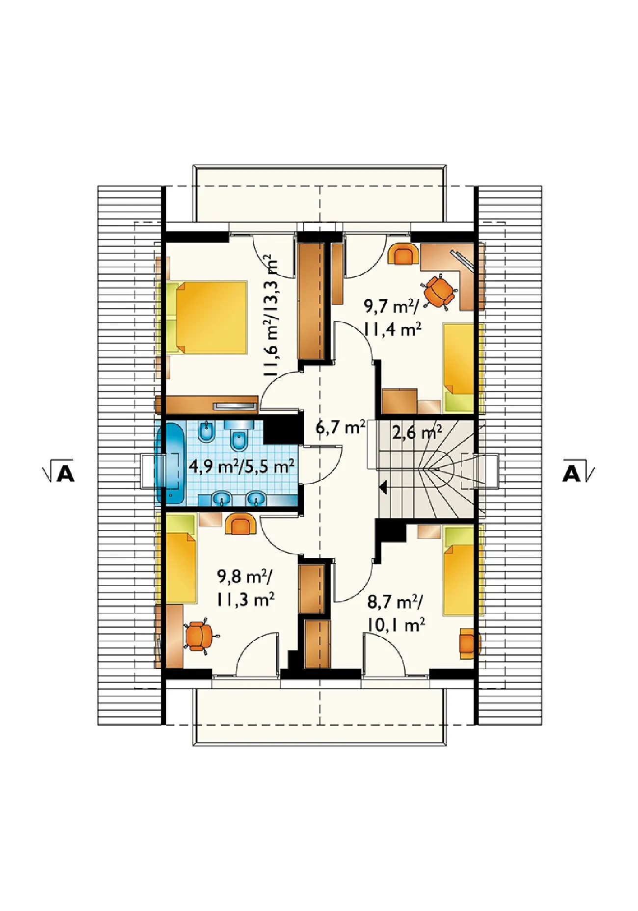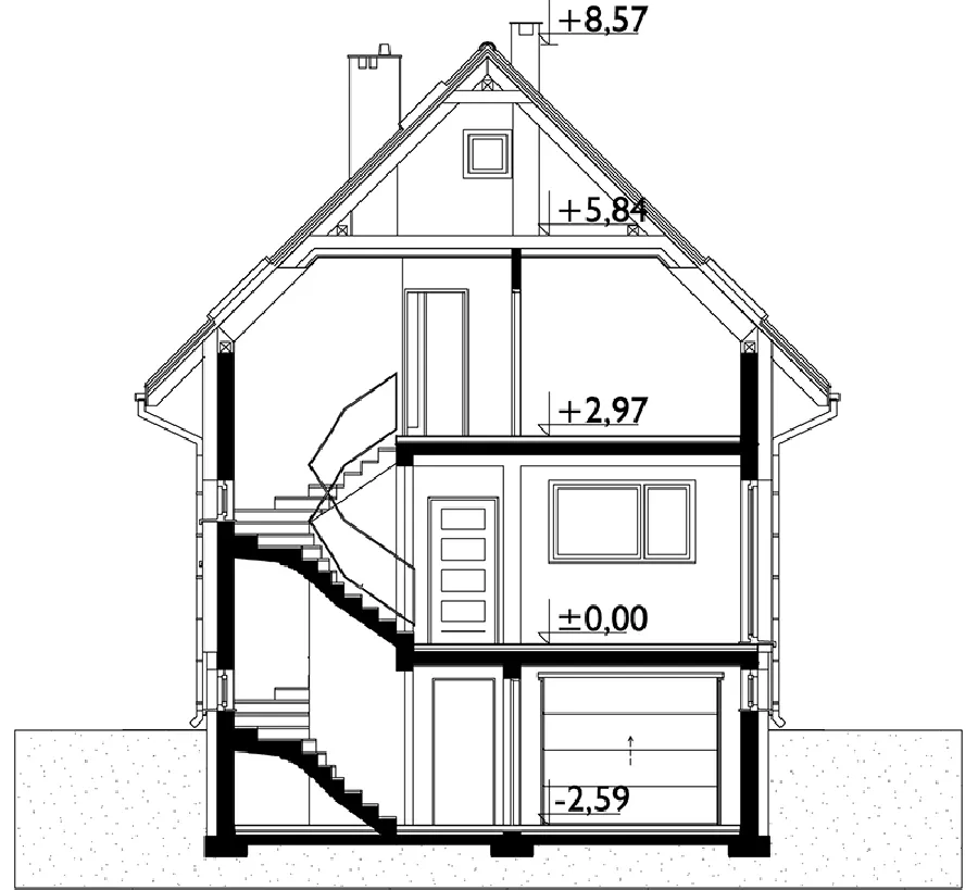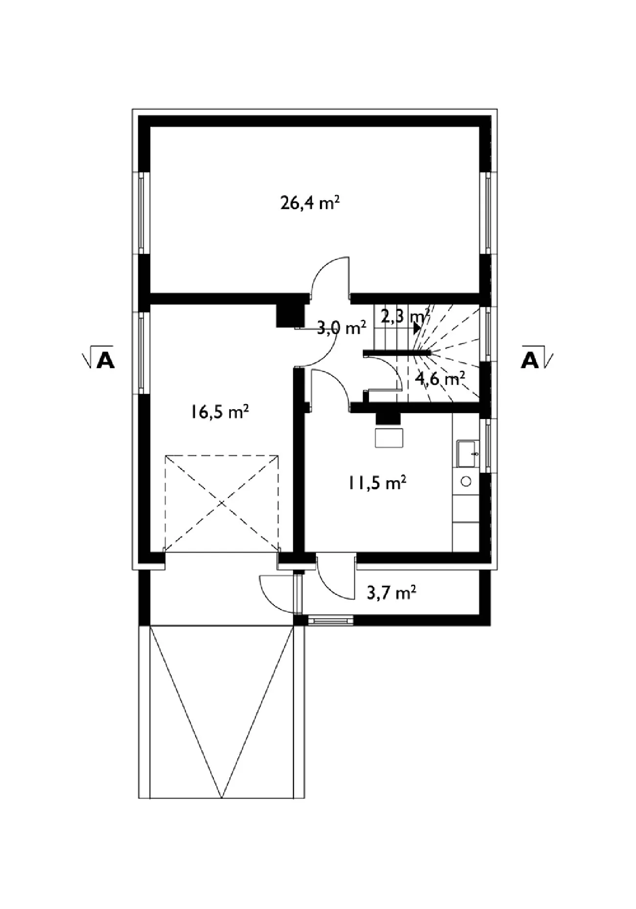 Проект дома «Бедронка», как и немного меньший по размеру «Корал», является одним из немногих проектов небольших домов с функциональным чердаком, предназначенных для узкого участка, предлагая полноценный подвал с гаражом. Фасад обоих проектов обращен к въезду на участок с двускатной крышей. Имея немного более широкую и короткую планировку, чем «Корал», «Бедронка» обладает той же функциональной программой, но более открытой жилой зоной на первом этаже и более компактной формой, без ниш или арок. Это позволяет разместить на чердаке еще одну спальню. Чердак освещается традиционным и экономичным способом – без мансардных окон, в основном через большие окна в фронтонных стенах. Проект дома «Бедронка» идеально подходит для участков с уклоном в сторону подъездной дороги. Полноценный подвал будет более доступным по цене, а терраса, открытая современными большими балконными окнами, удобно соединяет гостиную и сад без существенной разницы уровней. Балконы, закрывающие остекление и входную дверь, являются единственными вариациями в простой форме «Бедронки».