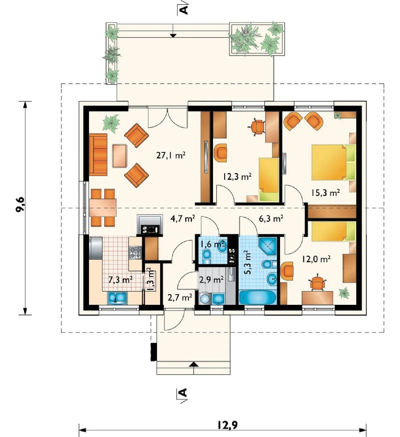 • Размеры: 12.9x9.6 м