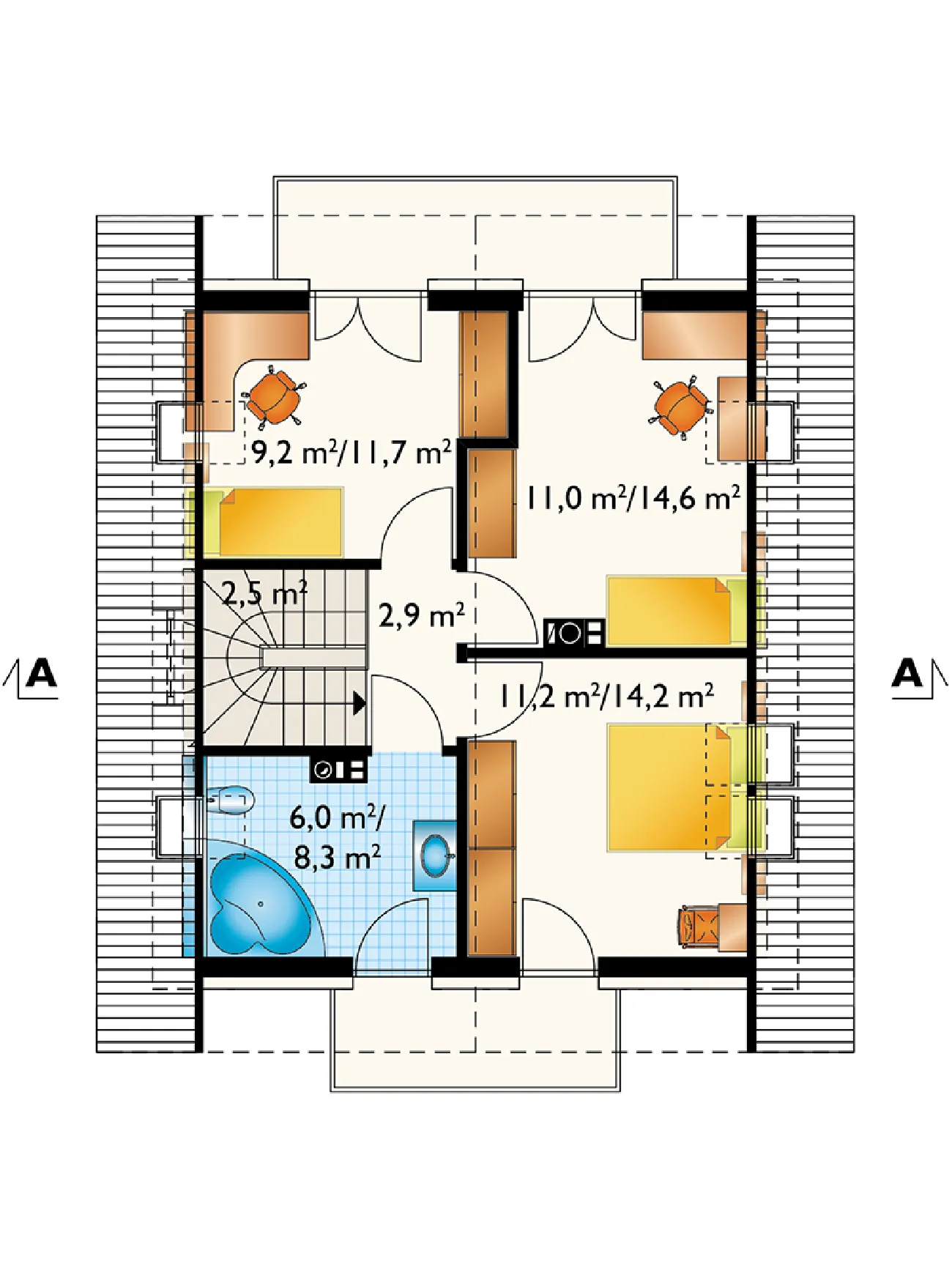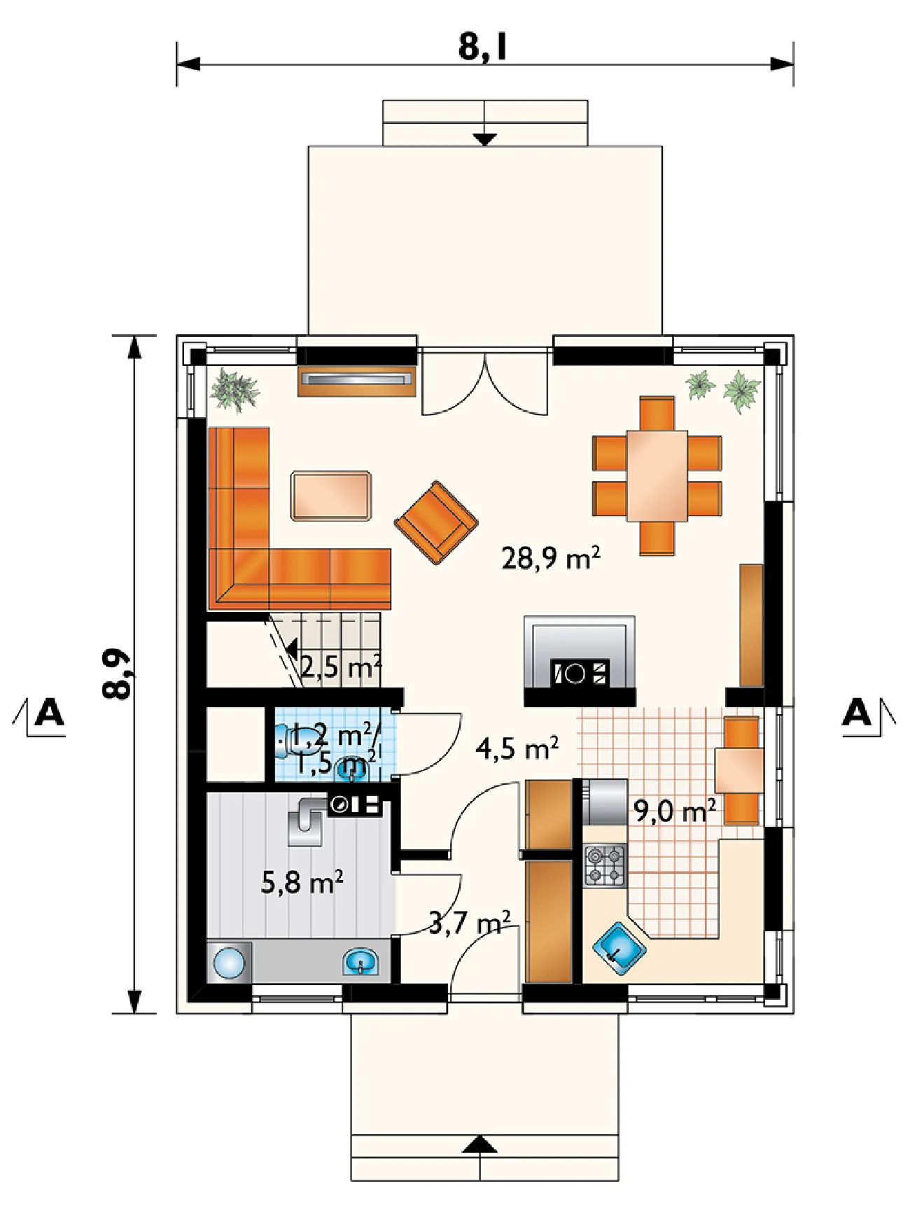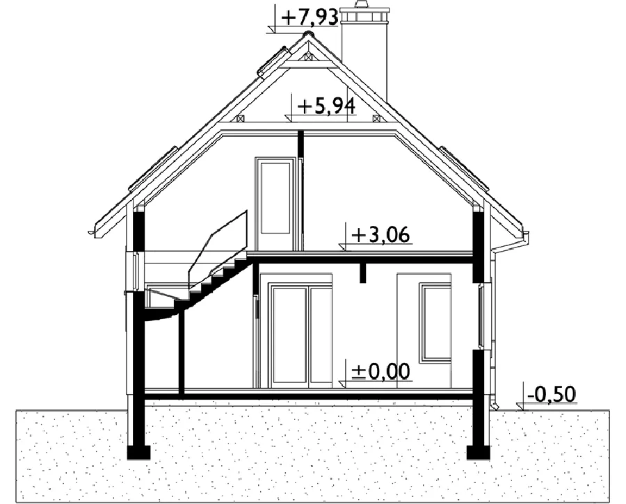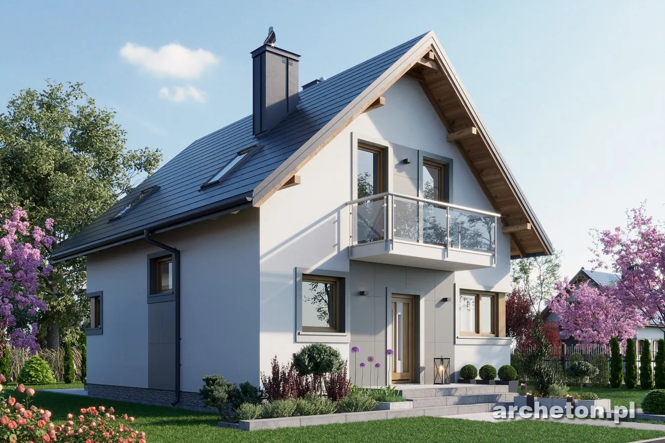 Проект небольшого энергоэффективного одноэтажного дома с функциональным чердаком имеет ограниченные возможности. Его площадь чуть более 90 м² и очень компактная планировка означают, что на первом этаже, помимо гостиной, кухни, туалета и коридора, размещается только одна небольшая комната. Проект дома «Дориан», попадающий в эту категорию, предлагает удобную котельную с прачечной, доступную из прихожей. Это одна из трех подобных концепций для простого, доступного здания с двускатной крышей, выходящей на въезд на участок. Две другие — это проект дома «Гавра» с большой ванной комнатой и проект дома «Гутек» с дополнительной комнатой на первом этаже. Проект дома «Дориан» также выделяется среди них своей обтекаемой, винтовой лестницей и самыми большими балконами над входом и садовой террасой. Простой силуэт «Дориана» был использован в качестве отправной точки для демонстрации современного стиля здания. Это подчеркивается тремя угловыми окнами, освещающими жилую зону, которые эффектно смотрятся как на фасадах, так и внутри.