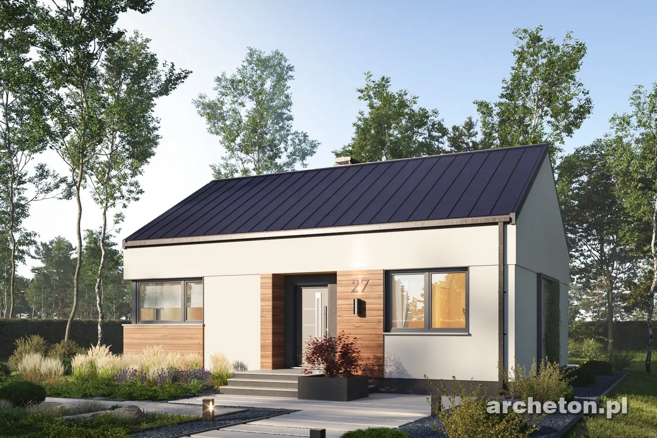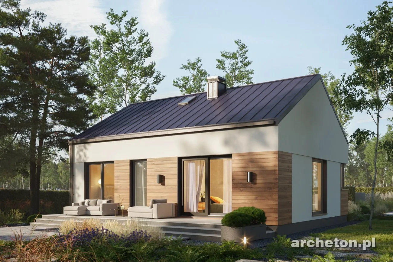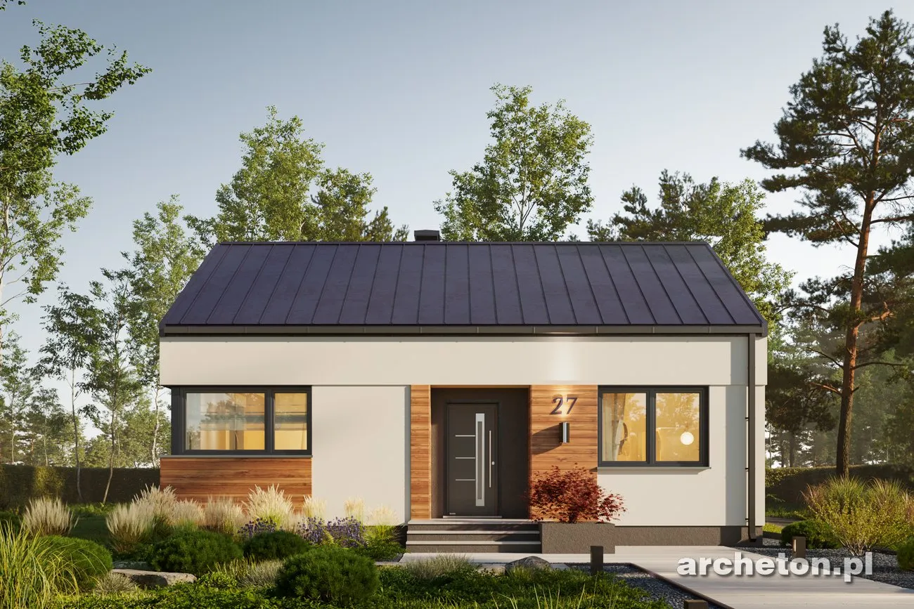 Описание проекта Antek Alfa – дом, не требующий сложного ухода, для семьи из трех человек. Этот проект идеально подходит для тех, кто ищет комфортное и элегантное пространство на относительно небольшой площади. Простая конструкция этого одноэтажного здания значительно снижает затраты на строительство, а его компактные размеры обеспечивают низкие эксплуатационные расходы. Дом имеет двускатную крышу, что исключает наличие карнизов. Это придает всей конструкции современный вид. Входная дверь расположена на более длинной внешней стене в центральной части здания. Небольшая аркада защищает вход, позволяя удобно открывать дверь даже в сильный дождь. Угловое окно на кухне открывает широкий вид на территорию перед домом. Терраса, почти такая же широкая, как и сам дом, простирается от садового фасада. Доступ к ней возможен из гостиной и одной из спален. Дома площадью до 80 квадратных метров , такие как представленный Antek Alfa, предлагают комфортное проживание благодаря тому, что все комнаты расположены на одном уровне. Планировка дома основана на прямоугольнике. Интерьер четко разделен на дневную и ночную зоны. Зона перемещения (холл) сведена к минимуму. Благодаря оптимизированной планировке и эффективному использованию пространства, спальни, ванная комната и кухня/гостиная имеют комфортные размеры. Оптимальное расположение окон и дверей позволяет установить встроенные шкафы полной глубины.