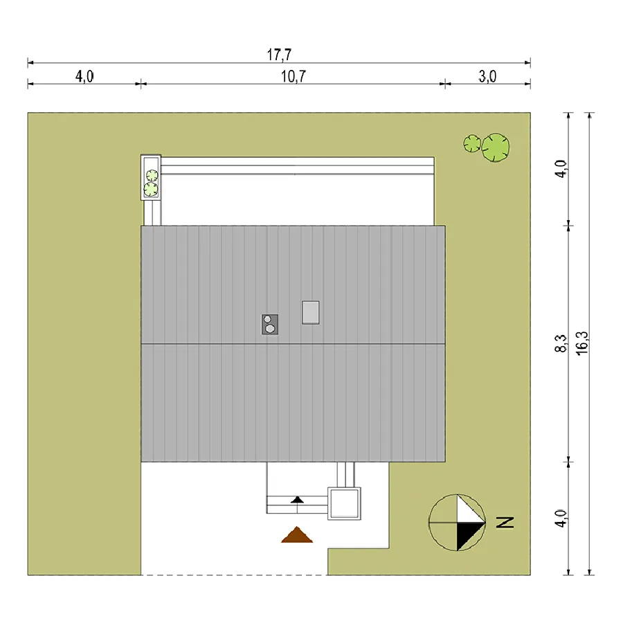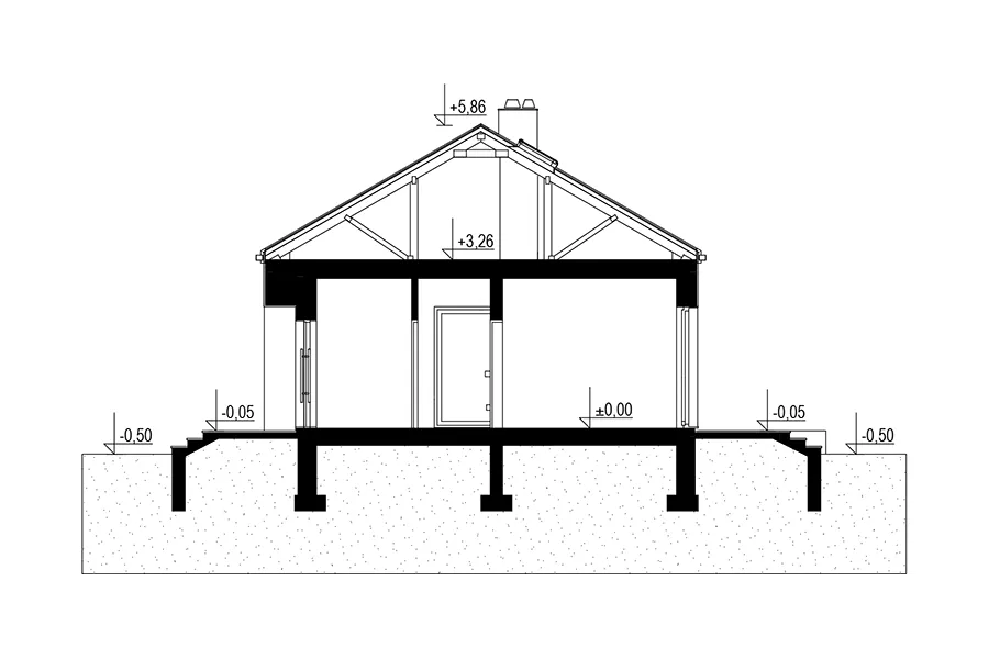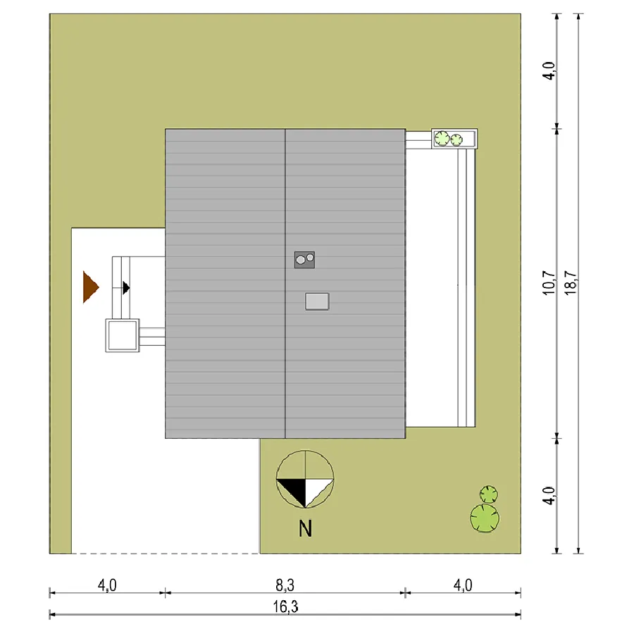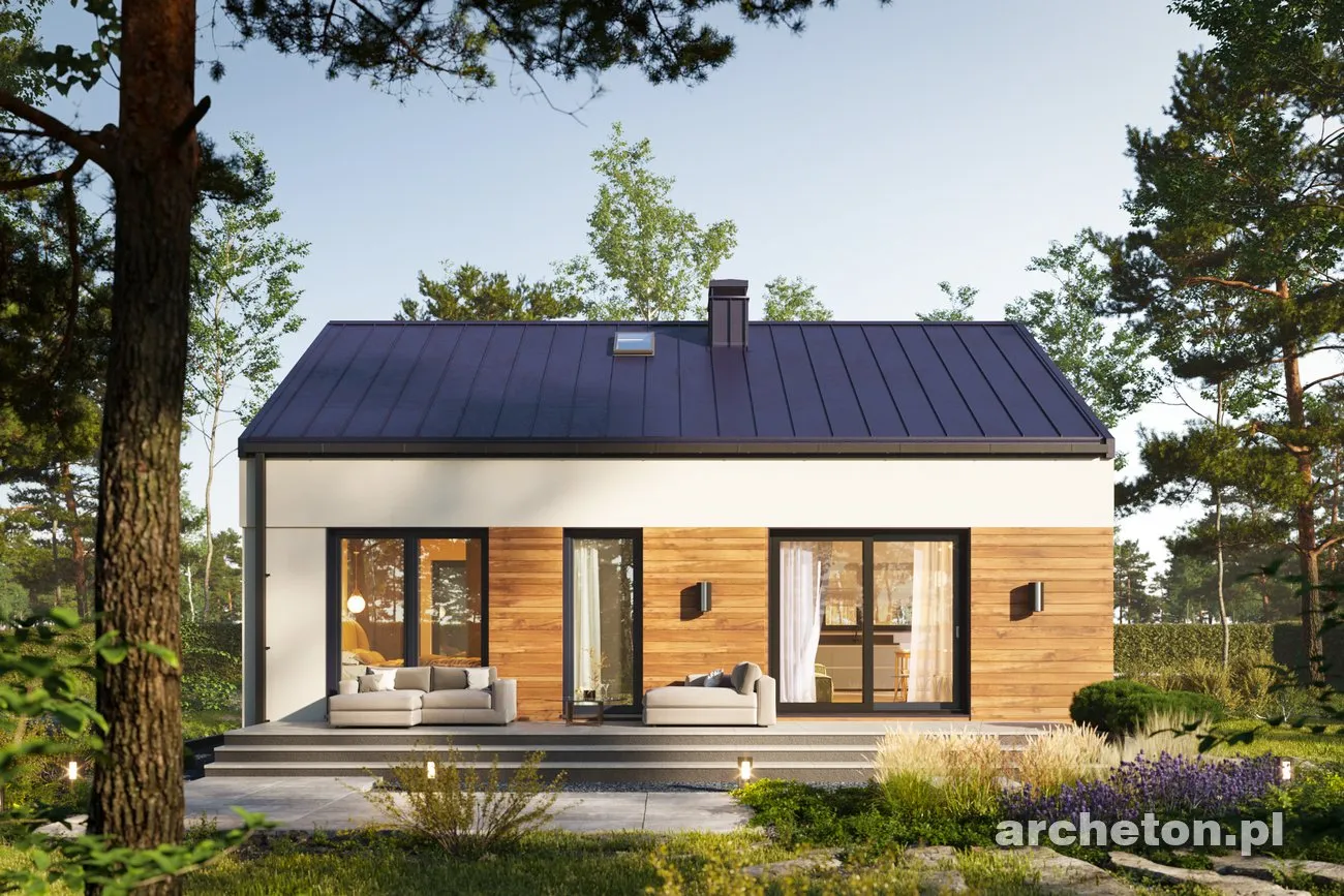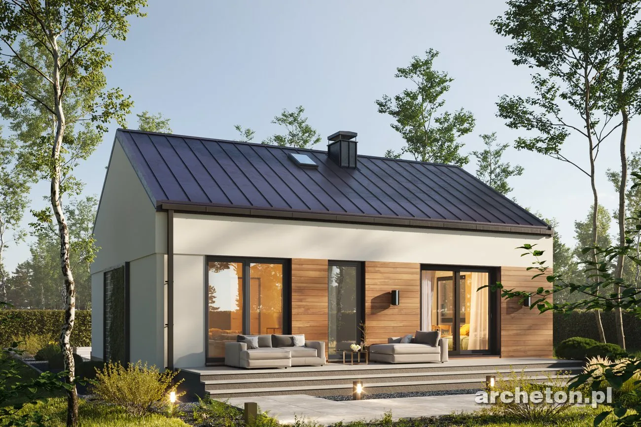 Описание проекта Antek Alfa – дом, не требующий сложного ухода, для семьи из трех человек. Этот проект идеально подходит для тех, кто ищет комфортное и элегантное пространство на относительно небольшой площади. Простая конструкция этого одноэтажного здания значительно снижает затраты на строительство, а его компактные размеры обеспечивают низкие эксплуатационные расходы. Дом имеет двускатную крышу, что исключает наличие карнизов. Это придает всей конструкции современный вид. Входная дверь расположена на более длинной внешней стене в центральной части здания. Небольшая аркада защищает вход, позволяя удобно открывать дверь даже в сильный дождь. Угловое окно на кухне открывает широкий вид на территорию перед домом. Терраса, почти такая же широкая, как и сам дом, простирается от садового фасада. Доступ к ней возможен из гостиной и одной из спален. Дома площадью до 80 квадратных метров , такие как представленный Antek Alfa, предлагают комфортное проживание благодаря тому, что все комнаты расположены на одном уровне. Планировка дома основана на прямоугольнике. Интерьер четко разделен на дневную и ночную зоны. Зона перемещения (холл) сведена к минимуму. Благодаря оптимизированной планировке и эффективному использованию пространства, спальни, ванная комната и кухня/гостиная имеют комфортные размеры. Оптимальное расположение окон и дверей позволяет установить встроенные шкафы полной глубины.