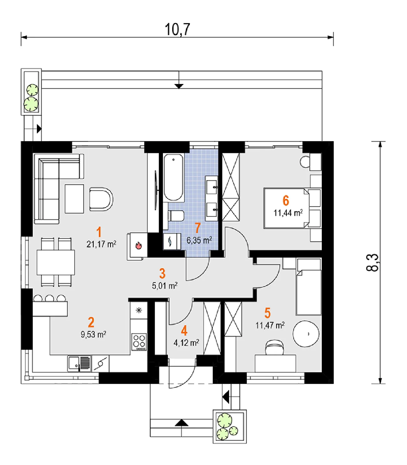 • Размеры: 10.7x8.3 м
