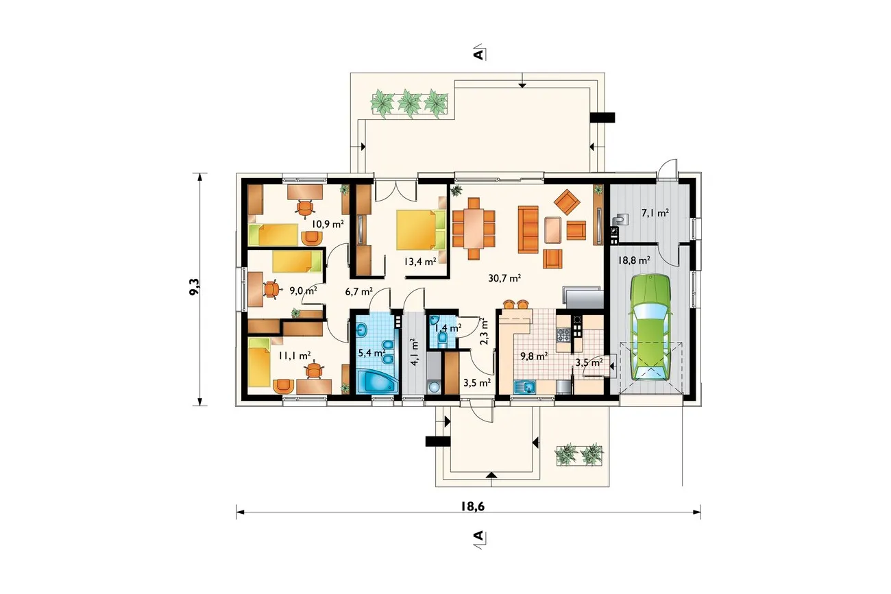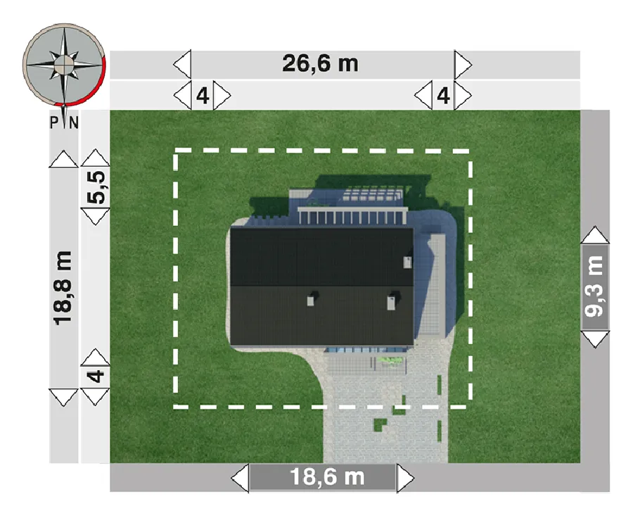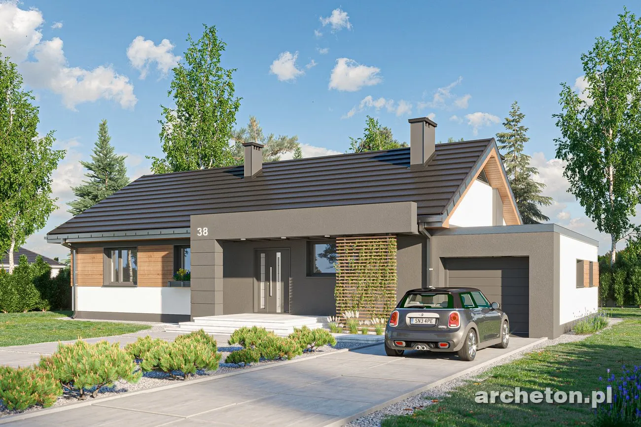 Нелегко придать просторному одноэтажному дому интересный вид, особенно если, как в проекте дома Линуса, он задуман как простой и недорогой в строительстве. На одном уровне прямоугольная планировка включает в себя гостиную и четыре спальни, доступ к которым осуществляется из коридора, ведущего из открытой гостиной. В конце был пристроен гараж с большой котельной, значительно расширяющий упорядоченную планировку. Такое здание отлично использует широкие, но неглубокие участки, но может показаться громоздким из-за длины основных фасадов. Поэтому в проекте дома Линуса предусмотрено разделение формы с помощью различных методов кровли. Двускатная крыша над гостиной и куб гаража с плоской крышей дополнительно разделены экранами, подчеркивающими вход и садовые террасы. Перголы отходят от внешних стен, скрывая часть традиционных карнизов. Это простое решение придает плоским, энергоэффективным фасадам дома Линуса глубину, террасам тень от солнца, а всей конструкции, несмотря на ее традиционный силуэт, современный вид.