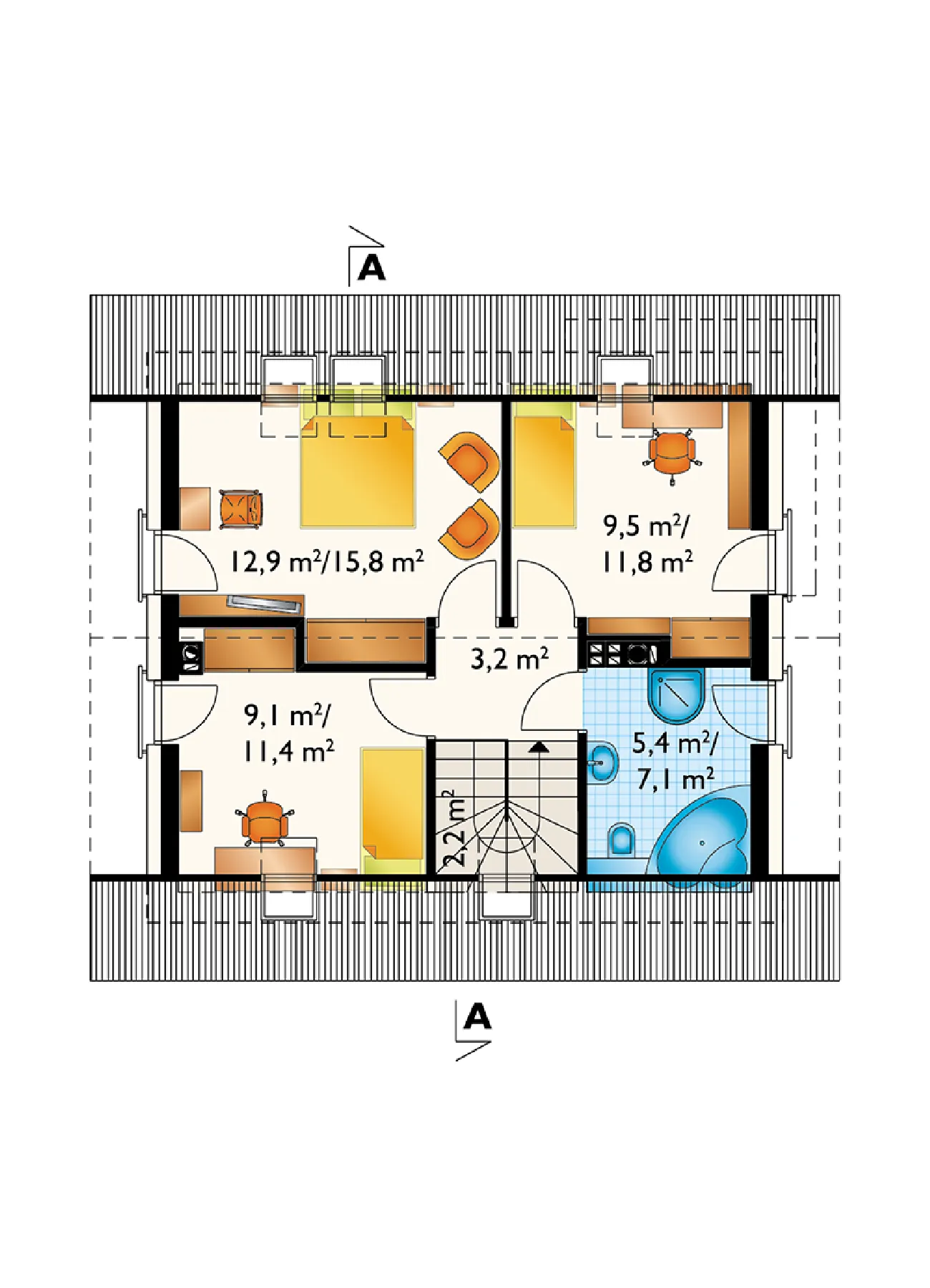 Проект дома Liza Karo сочетает в себе простоту и рационализм с привлекательным вниманием к архитектурным деталям. Энергоэффективная форма небольшого дома Liza покрыта экономичной двускатной крышей. На первом этаже расположена открытая гостиная с котельной и удобным вестибюлем, а на мансарде находятся три спальни с ванной комнатой для четырех человек. Отсутствие балконов компенсируется возможностью открытия комнат в сад через балконные окна, защищенные прозрачной балюстрадой. Гостиная исключительно просторна для одноэтажного дома с такой полезной мансардой. Помимо столовой, в ней находится зона отдыха и камин. Раздвижные двери экономят место и позволяют летом беспрепятственно расширять гостиную на террасу. Остекление в углу столовой эффектно контрастирует со строгим силуэтом дома Liza. Геометрические рамы, поддерживающие перголы над главным входом и террасой, завершают общий дизайн. Дом-близнец, Liza, предлагает еще более строгую форму и меньшую площадь застройки.