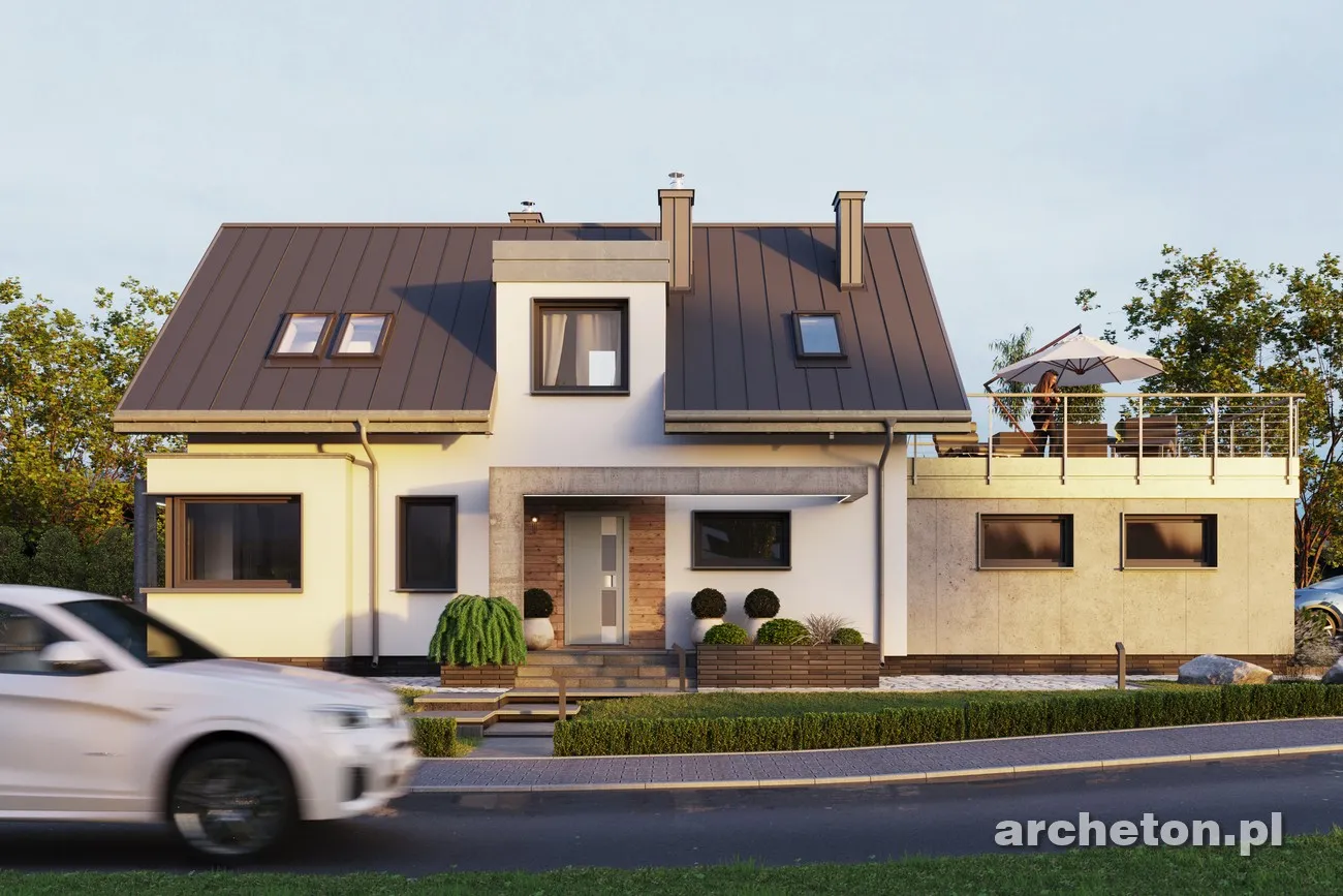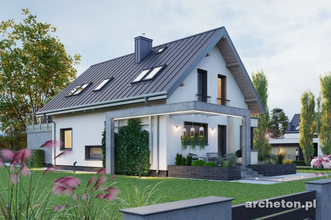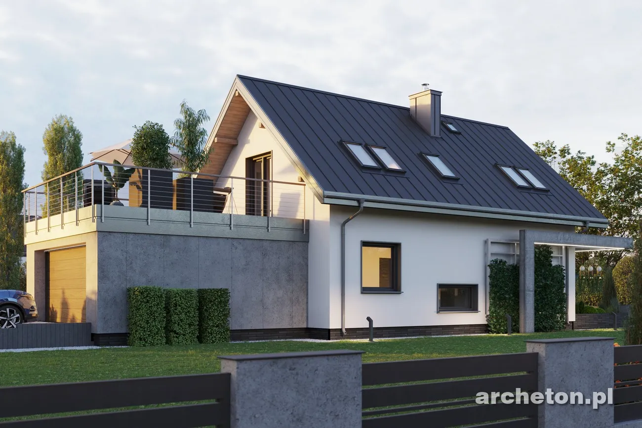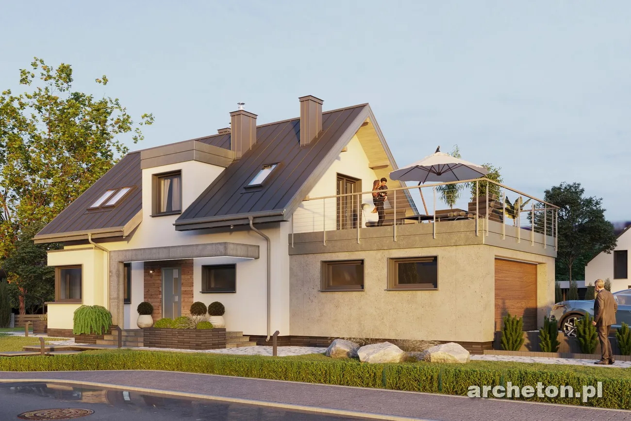 Небольшой современный одноэтажный дом с функциональным чердаком и гаражом на две машины — настоящая жемчужина. Проект дома от Lutek также отлично подходит для неглубокого или узкого участка с южным входом. Стройная прямоугольная планировка жилой зоны дополнительно расширяется за счет гаража, дверь которого расположена перпендикулярно входу. Благодаря гостиной, расположенной в передней части дома, это непревзойденный вариант для углового участка. Основные комнаты стандартного размера, но прекрасно дополняются подсобными помещениями, включая большую котельную у главного входа. На первом этаже, помимо открытой гостиной с привлекательной обеденной зоной в угловом выступе, есть место для прачечной под лестницей, а в конце коридора находится тихий кабинет. На первый взгляд скромный чердак также имеет свой козырь: просторная терраса над гаражом, доступная из главной спальни с гардеробной. Красивая ванная комната освещается окном в мансардном окне с плоской крышей. В проекте дома от Lutek также предусмотрено эффектное остекление в гостиной и пергола, огибающая угол и выходящая на террасу. Она поддерживается консольным кронштейном на опорах, продолжая форму плоской крыши над главным входом.