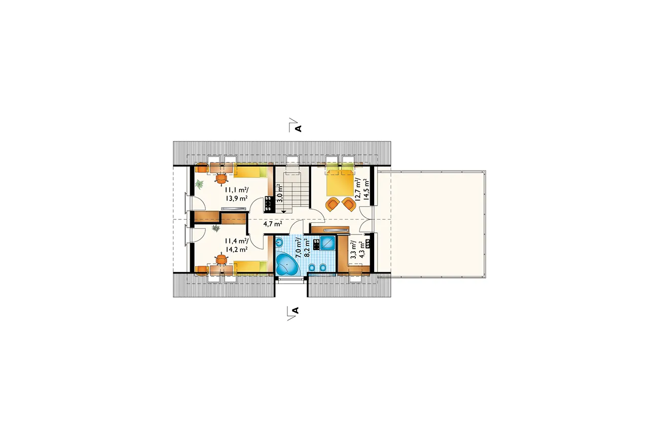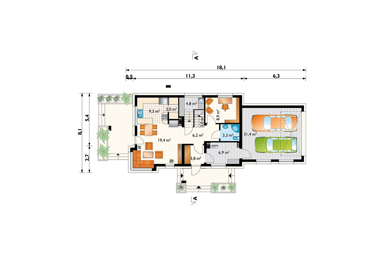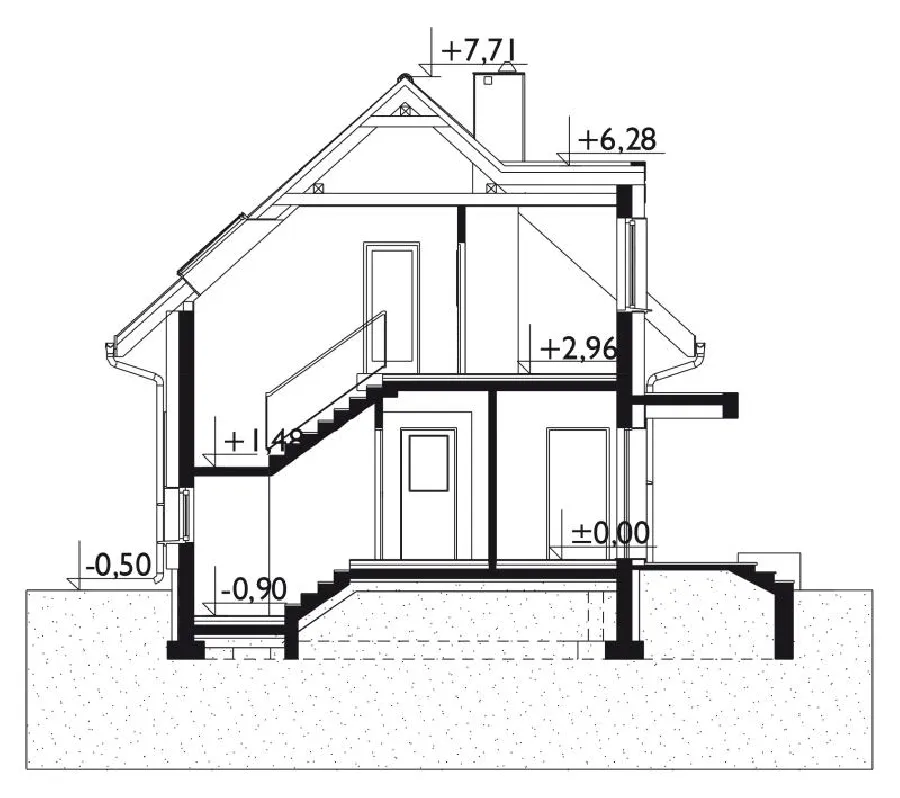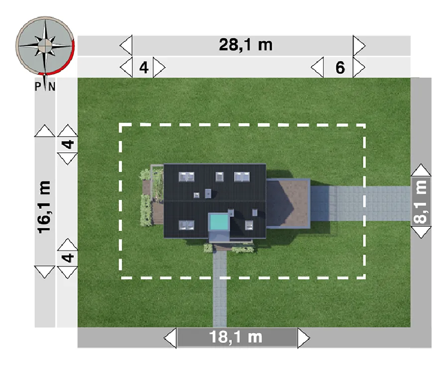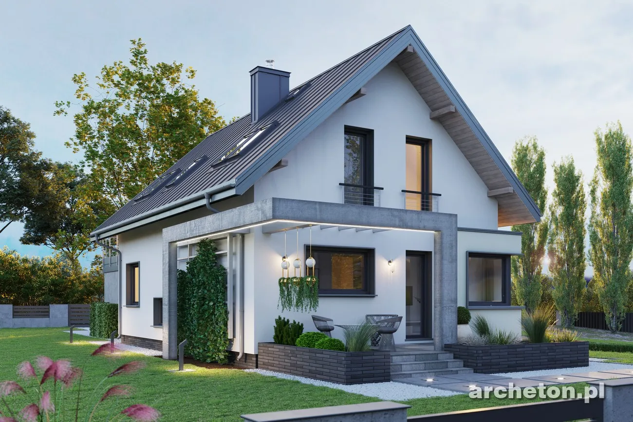 Небольшой современный одноэтажный дом с функциональным чердаком и гаражом на две машины — настоящая жемчужина. Проект дома от Lutek также отлично подходит для неглубокого или узкого участка с южным входом. Стройная прямоугольная планировка жилой зоны дополнительно расширяется за счет гаража, дверь которого расположена перпендикулярно входу. Благодаря гостиной, расположенной в передней части дома, это непревзойденный вариант для углового участка. Основные комнаты стандартного размера, но прекрасно дополняются подсобными помещениями, включая большую котельную у главного входа. На первом этаже, помимо открытой гостиной с привлекательной обеденной зоной в угловом выступе, есть место для прачечной под лестницей, а в конце коридора находится тихий кабинет. На первый взгляд скромный чердак также имеет свой козырь: просторная терраса над гаражом, доступная из главной спальни с гардеробной. Красивая ванная комната освещается окном в мансардном окне с плоской крышей. В проекте дома от Lutek также предусмотрено эффектное остекление в гостиной и пергола, огибающая угол и выходящая на террасу. Она поддерживается консольным кронштейном на опорах, продолжая форму плоской крыши над главным входом.