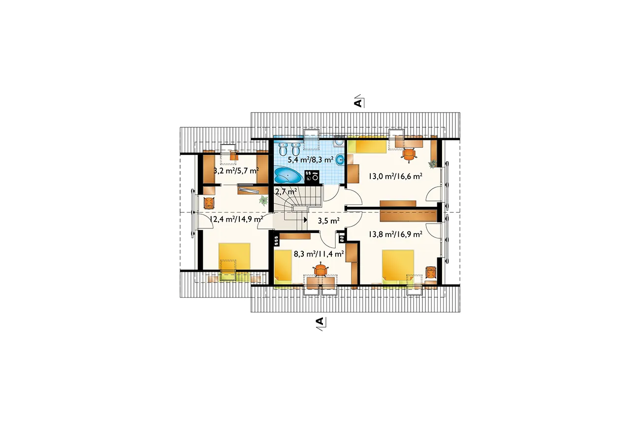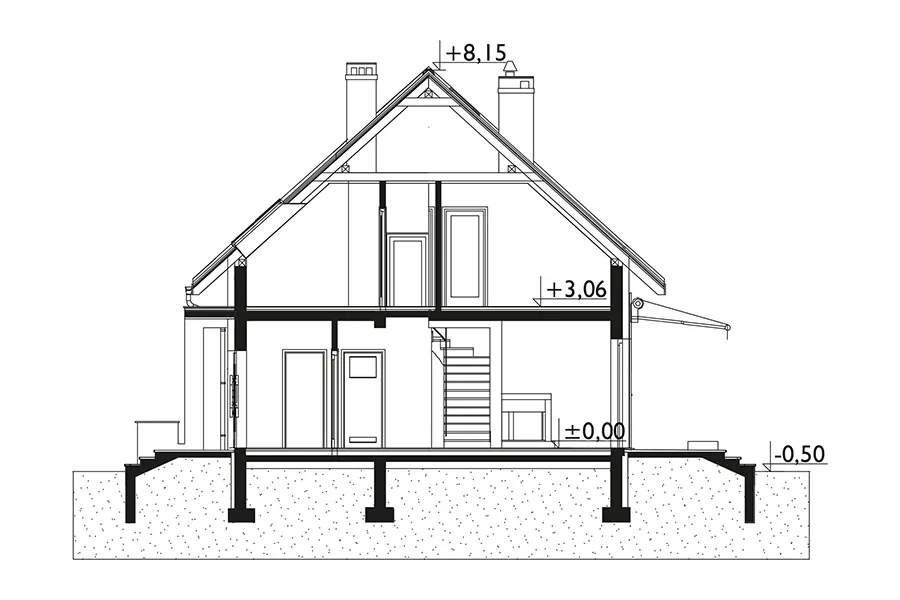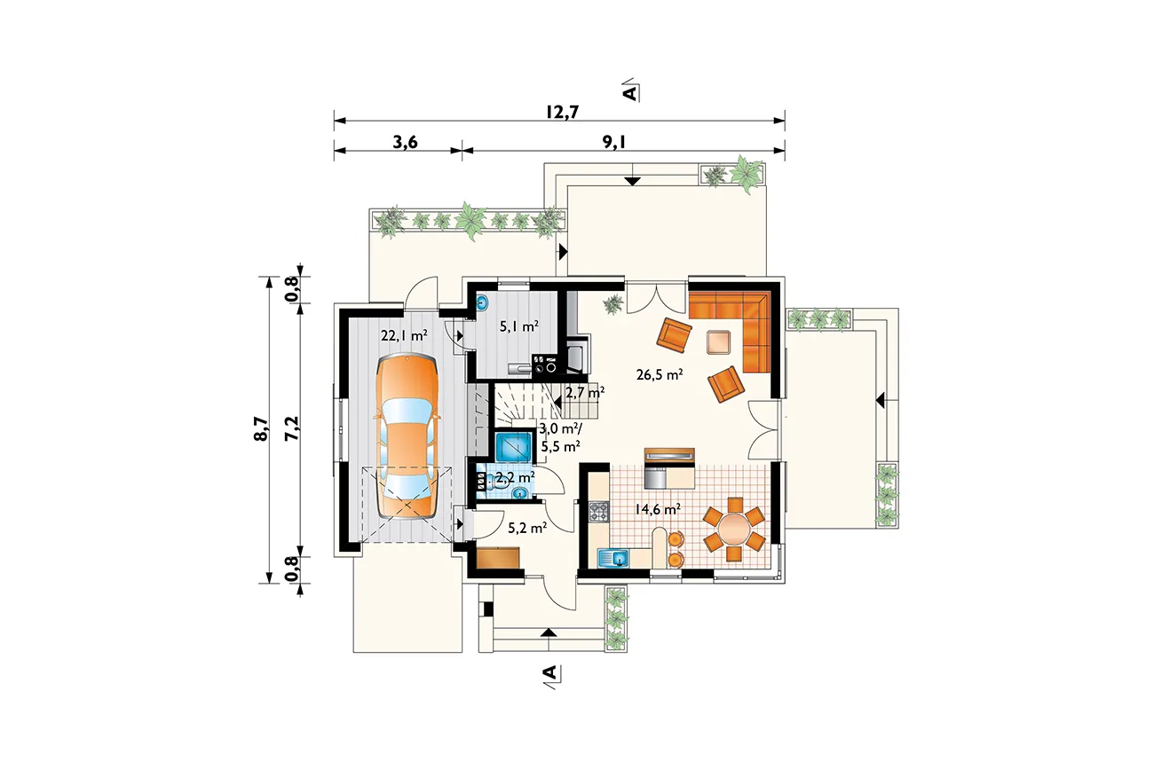 Семейство домов Malina предлагает несколько вариантов небольших одноэтажных домов с функциональным чердаком и пристроенным гаражом. Во всех проектах квадратная жилая зона покрыта двускатной крышей с коньком, параллельным подъездной дорожке. Основные различия между этими проектами заключаются в способе укладки крыши гаража. Дом Malina Alfa больше по площади и, как и Malina, имеет крутую двускатную крышу с дополнительной жилой площадью. Все варианты Malina имеют схожую планировку и размеры комнат. Коридор, соединяющий квартиру с подсобным помещением, ведет через небольшой холл с ванной комнатой в кухню-гостиную открытой планировки. Особенно привлекательной особенностью является прямая лестница с площадкой в ​​гостиной, рядом с камином. Ее шахты интегрированы с дымоходом котельной, доступ к которому осуществляется из гаража, но который расположен внутри основного корпуса здания. На чердаке расположены четыре спальни, включая главную спальню на антресольном уровне, оборудованную гардеробной и большой ванной комнатой. Проект дома Malina Alfa отличается простой крышей без мансардных окон, двойными окнами-подиумами вместо балконов и современными деталями: угловым окном на кухне и плоской крышей над входом.
