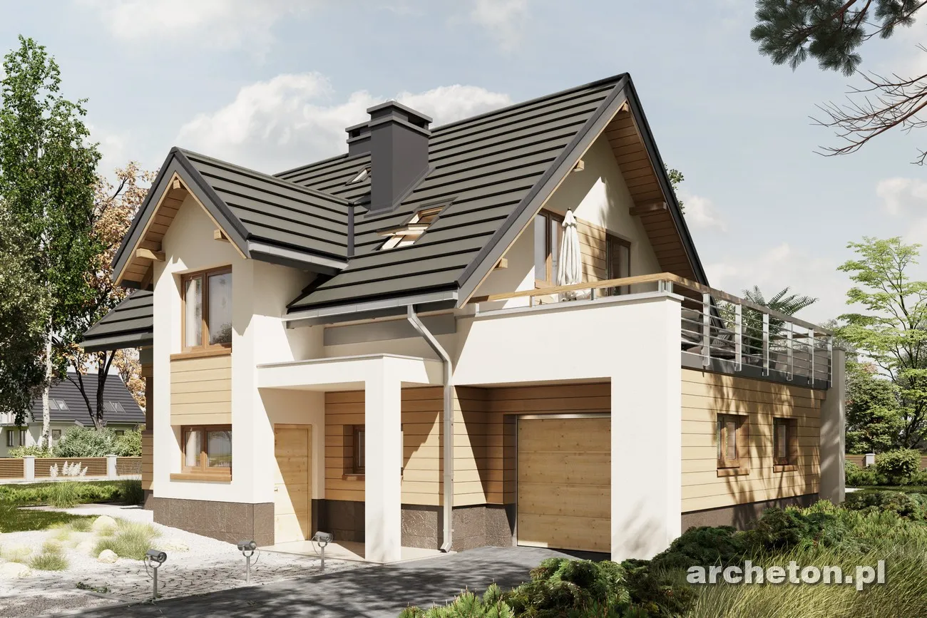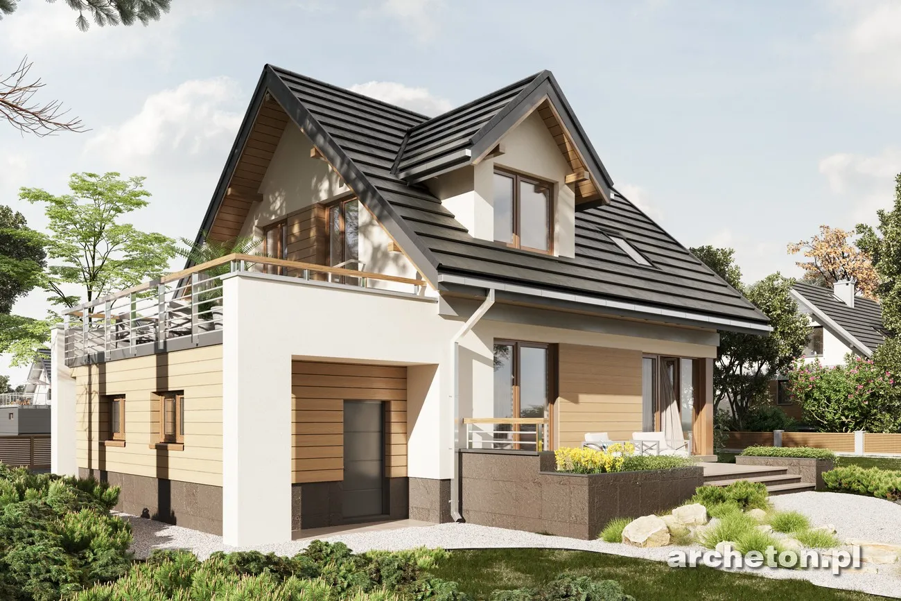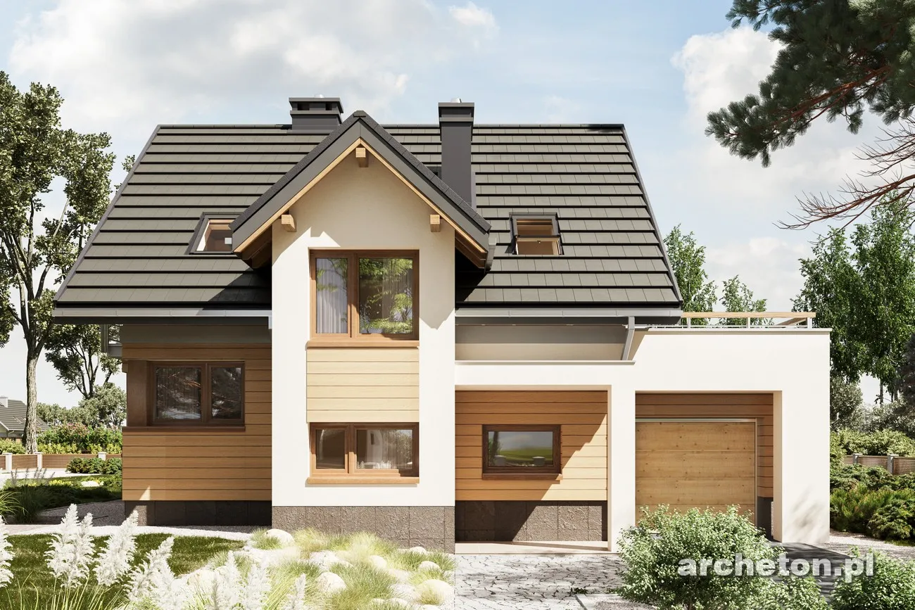 Концепции небольшого дома с функциональным чердаком на участке с небольшим уклоном к въезду уже представлены в Archeton семьями Краба и Фиона. Семья Мирона выделяется более авангардным стилем в группе предложений с дополнительной комнатой на первом этаже, а также предлагает наименьшее разнообразие размеров и функциональной планировки среди аналогичных вариантов. Входная зона в проекте дома Neo от Мироны, с прихожей, котельной и гаражом, расположена ниже относительно прихожей и гостиной открытой планировки на основном уровне первого этажа. Она также расширена, вместе с лестничной площадкой, в виде высокого выступа. На чердаке расположены три спальни с большой ванной комнатой, а прачечная удобно расположена на антресоли. Эта планировка покрыта простой двускатной крышей. Модернистский стиль здания определяется угловыми окнами кухни и гостиной, а также кубами пристроенного гаража и выступом с обеденной зоной на другой стене. Еще одна отличительная деталь — это балюстрада террасы, полностью выступающая над гаражными воротами, и аналогичный навес над входной дверью. Проект дома Мирона Нео выделяет эту семью традиционными мансардными окнами с двускатными крышами спереди и в саду.