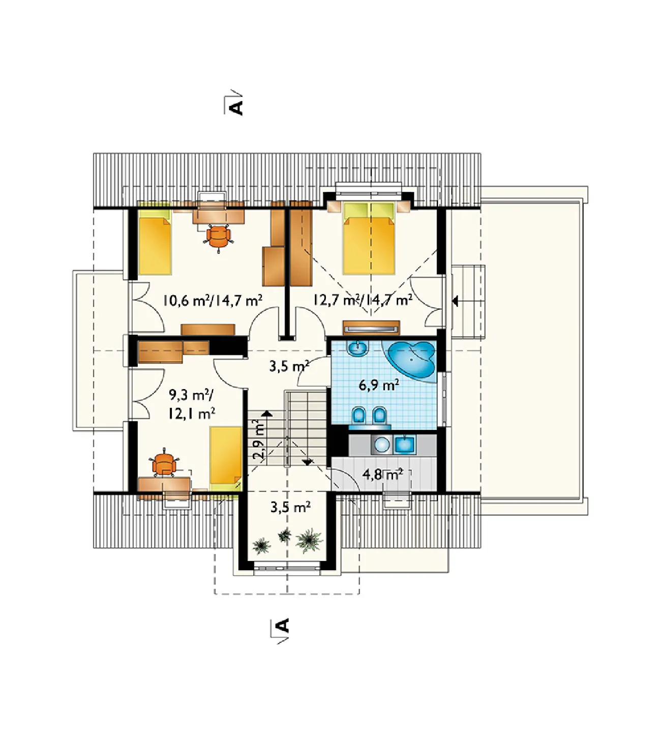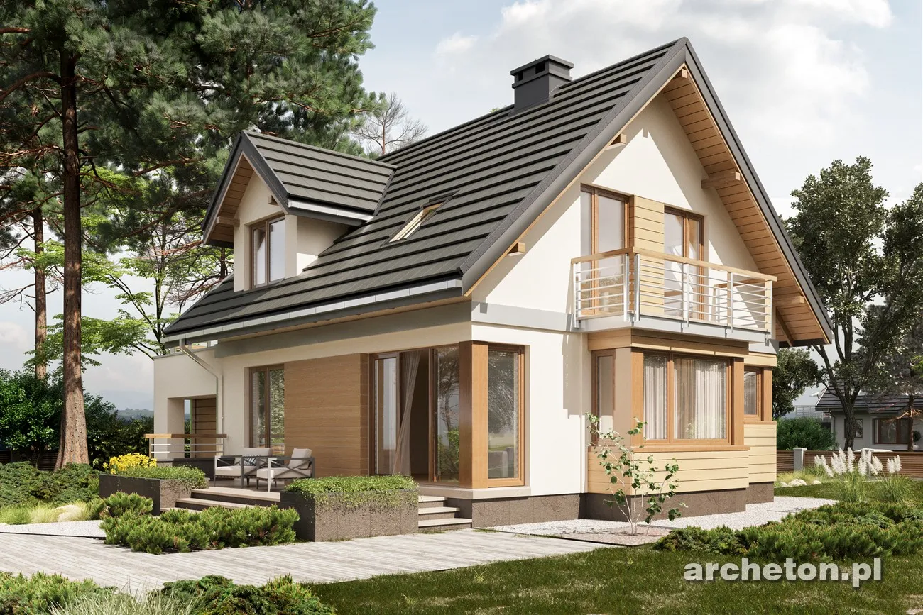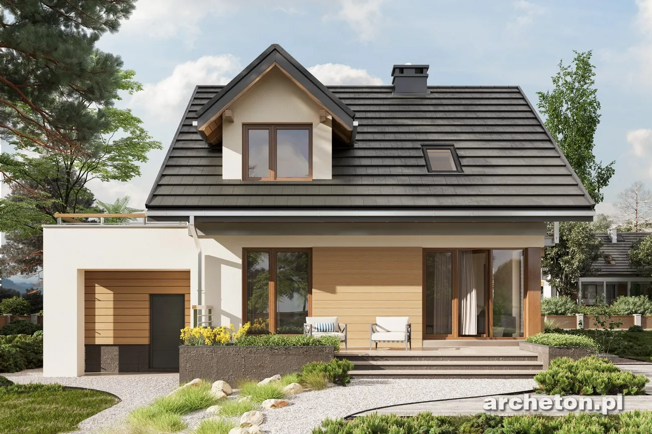 Концепции небольшого дома с функциональным чердаком на участке с небольшим уклоном к въезду уже представлены в Archeton семьями Краба и Фиона. Семья Мирона выделяется более авангардным стилем в группе предложений с дополнительной комнатой на первом этаже, а также предлагает наименьшее разнообразие размеров и функциональной планировки среди аналогичных вариантов. Входная зона в проекте дома Neo от Мироны, с прихожей, котельной и гаражом, расположена ниже относительно прихожей и гостиной открытой планировки на основном уровне первого этажа. Она также расширена, вместе с лестничной площадкой, в виде высокого выступа. На чердаке расположены три спальни с большой ванной комнатой, а прачечная удобно расположена на антресоли. Эта планировка покрыта простой двускатной крышей. Модернистский стиль здания определяется угловыми окнами кухни и гостиной, а также кубами пристроенного гаража и выступом с обеденной зоной на другой стене. Еще одна отличительная деталь — это балюстрада террасы, полностью выступающая над гаражными воротами, и аналогичный навес над входной дверью. Проект дома Мирона Нео выделяет эту семью традиционными мансардными окнами с двускатными крышами спереди и в саду.