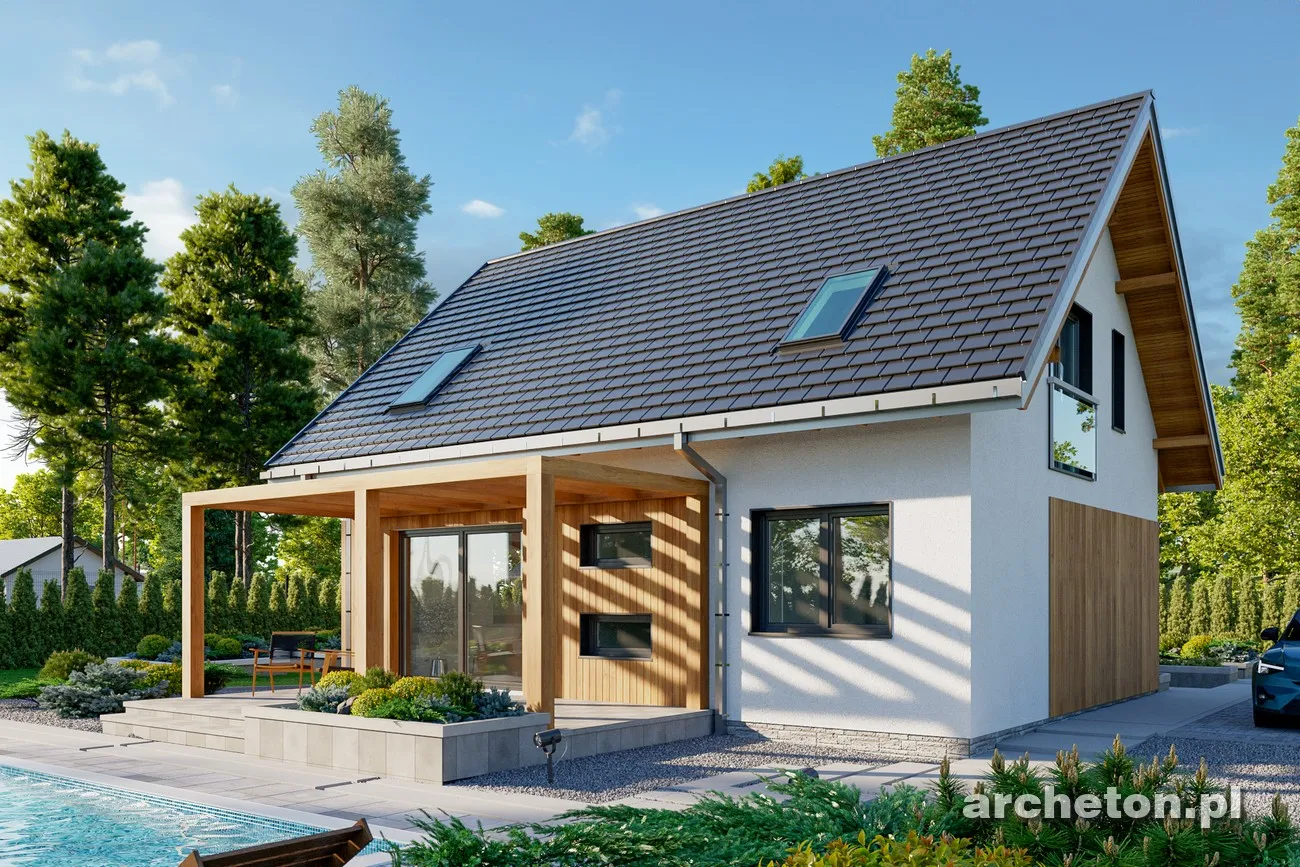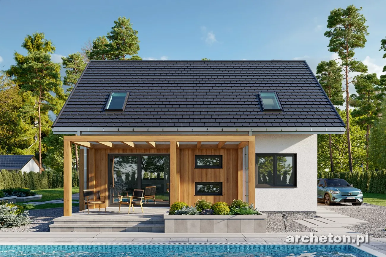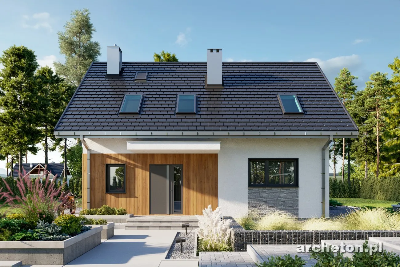 Проект дома Олафа Сто — это немного уменьшенная версия проекта Олафа Соло. Наряду с «Самбор Эко», он отличается самой простой формой в группе одноэтажных домов с функциональным чердаком, без гаража и площадью около 100 м². Он также включает в себя единое, но более четко разделенное жилое пространство, открытое в прихожую, удобную котельную и практичное место для хранения под лестницей. Благодаря более вытянутой планировке, чем в «Самбор Эко», рядом с кухней можно разместить кладовую, а немного иная компоновка несущих стен позволяет создать привлекательный проем лестницы в гостиную. Дополнительная комната на первом этаже позволяет обустроить полноценную квартиру и продлить срок строительства. Чердак, который может быть завершен на втором этапе, предлагает три хорошо спланированные спальни, экономично освещенные без использования мансардных окон и оборудованные продуманной системой встроенных шкафов, а также ванную комнату. В отличие от более крупных версий — Olaf (с гаражом) и Olaf Solo — в проекте дома Olaf Sto отсутствуют балконы, что дополняет концепцию энергоэффективности, разработанную семьей. Главный вход подчеркнут массивным навесом, а из сада внимание привлекают широкие раздвижные двери, ведущие на террасу, и запланированная пергола.