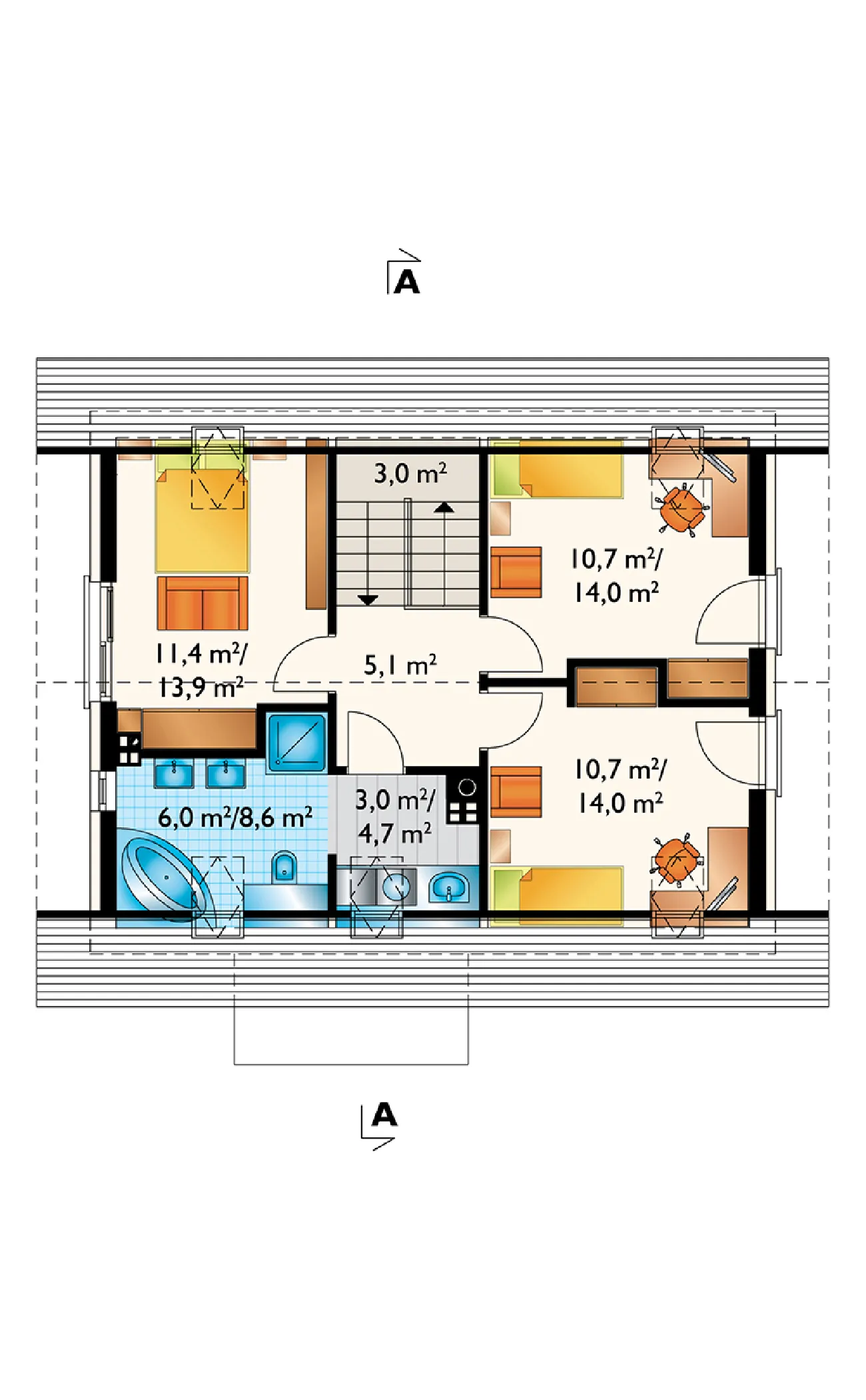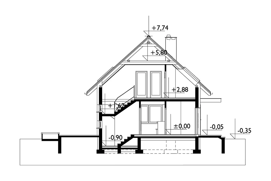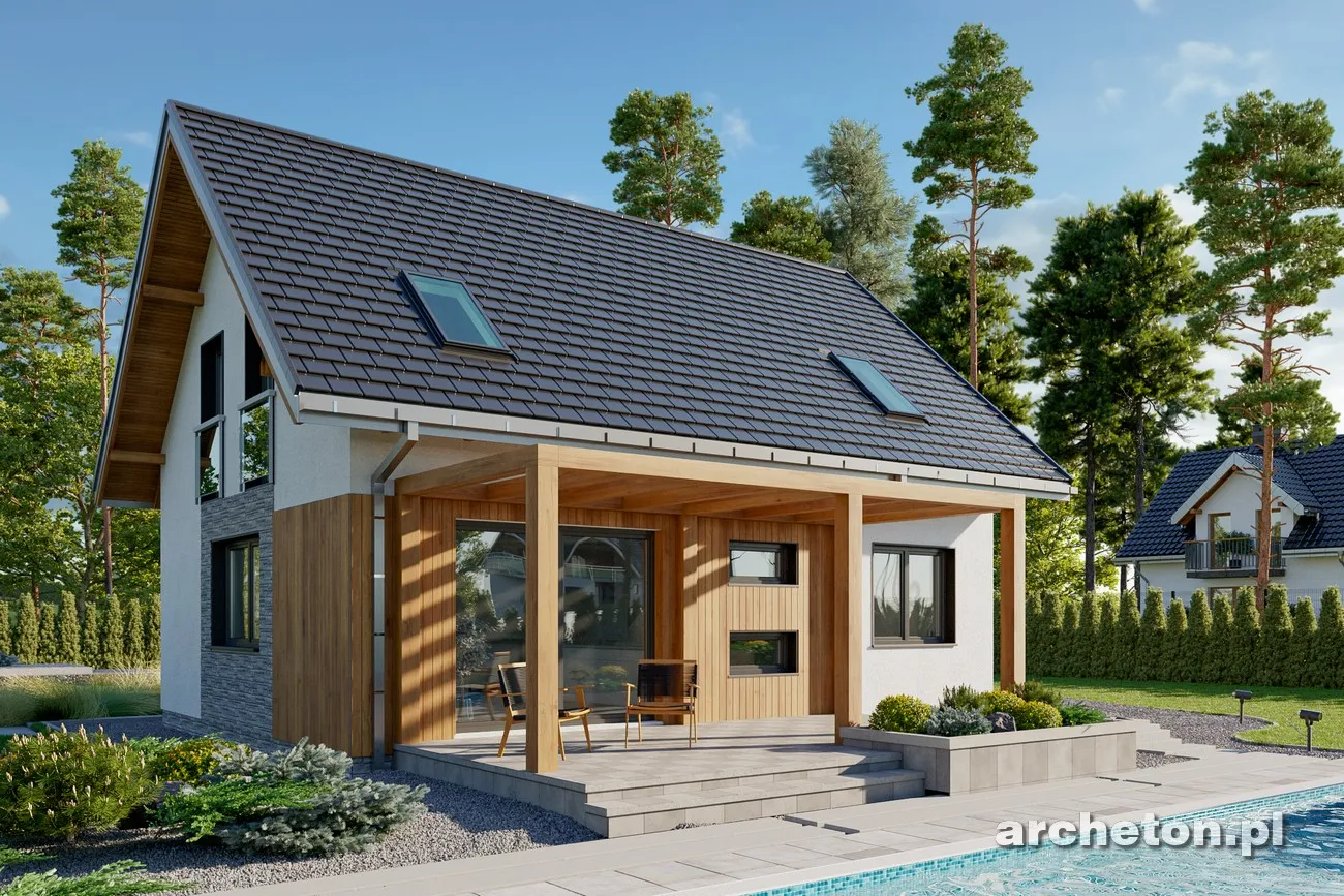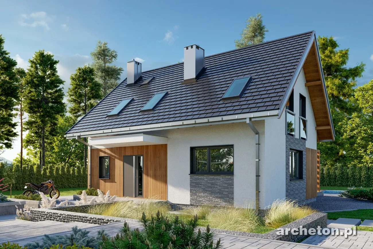 Проект дома Олафа Сто — это немного уменьшенная версия проекта Олафа Соло. Наряду с «Самбор Эко», он отличается самой простой формой в группе одноэтажных домов с функциональным чердаком, без гаража и площадью около 100 м². Он также включает в себя единое, но более четко разделенное жилое пространство, открытое в прихожую, удобную котельную и практичное место для хранения под лестницей. Благодаря более вытянутой планировке, чем в «Самбор Эко», рядом с кухней можно разместить кладовую, а немного иная компоновка несущих стен позволяет создать привлекательный проем лестницы в гостиную. Дополнительная комната на первом этаже позволяет обустроить полноценную квартиру и продлить срок строительства. Чердак, который может быть завершен на втором этапе, предлагает три хорошо спланированные спальни, экономично освещенные без использования мансардных окон и оборудованные продуманной системой встроенных шкафов, а также ванную комнату. В отличие от более крупных версий — Olaf (с гаражом) и Olaf Solo — в проекте дома Olaf Sto отсутствуют балконы, что дополняет концепцию энергоэффективности, разработанную семьей. Главный вход подчеркнут массивным навесом, а из сада внимание привлекают широкие раздвижные двери, ведущие на террасу, и запланированная пергола.
