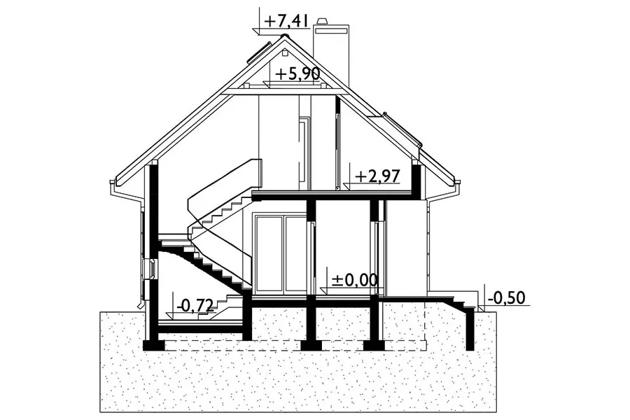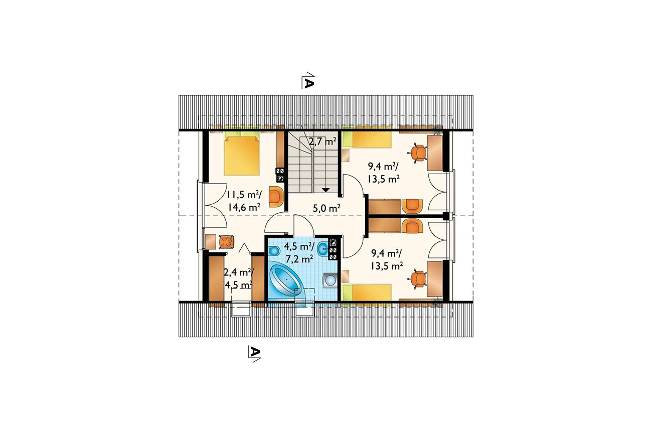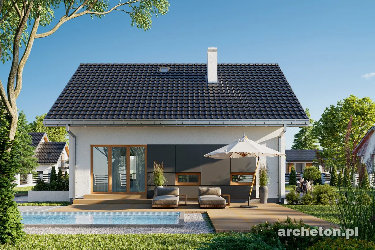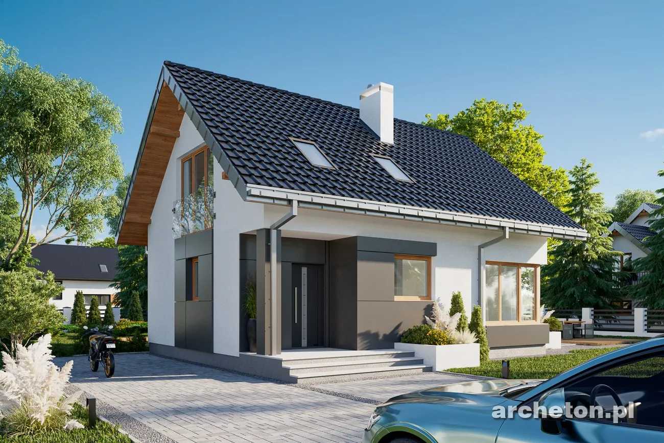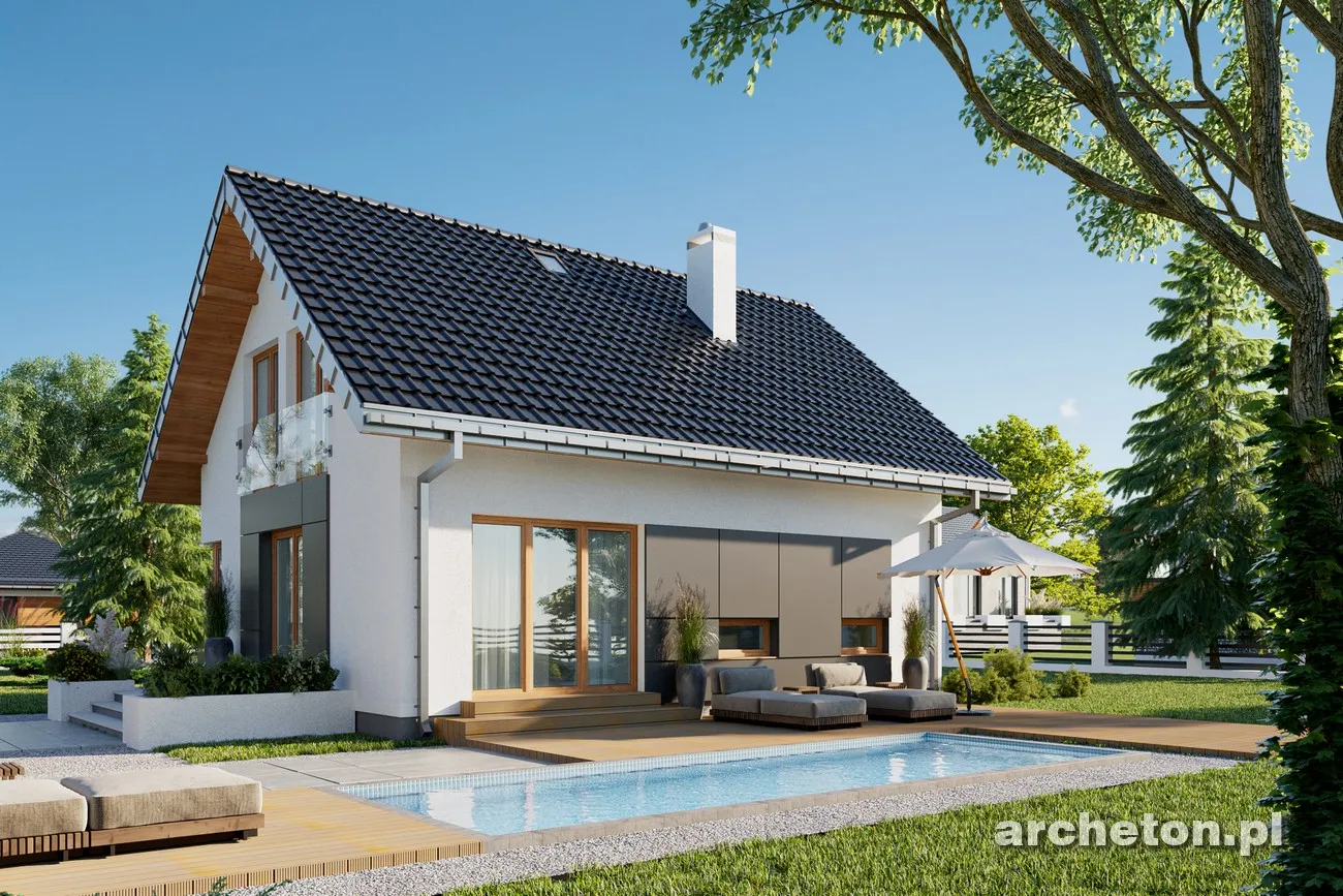 Дом с минималистичным, но комфортным дизайном, с функциональным чердаком и без гаража, общей полезной площадью около 90 м², может быть построен по проекту дома «Селия» или на основе несколько более короткой концепции «Калинецка». Оба решения отличаются рациональной формой с простой двускатной крышей без мансардных окон, дополненной лишь практичной угловой нишей для входа с колонной. В более современном проекте «Селия» вместо исторической детали в виде пристройки со столовой предложено эффектное угловое окно. Планировка открытой, просторной гостиной обеспечивает освещение из окон с трех разных сторон, что позволяет значительно гибко размещать дом на участке. На участках, обращенных как на юг, так и на север, гостиная и кухня будут светлыми и теплыми большую часть дня. Функциональная программа первого этажа дополнена относительно большим котельным и небольшой ванной комнатой. Проект дома «Селия» отличается исключительно искусно спланированной ночной зоной с тремя спальнями и большой ванной комнатой, без ущерба для пространства. Как и в случае с проектом дома Дюймовочки, он отличается экономичностью строительства, но его очаровательная архитектурная форма основана на более простом, современном стиле и деталях.