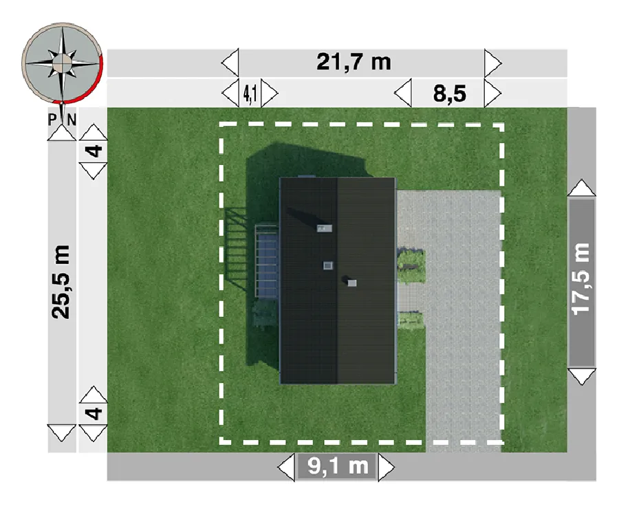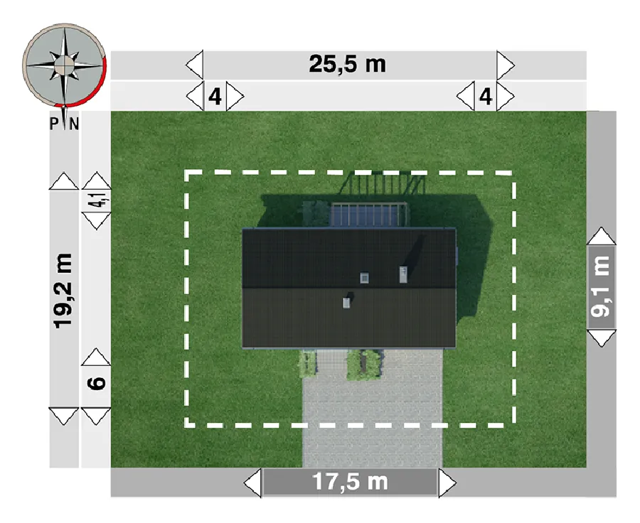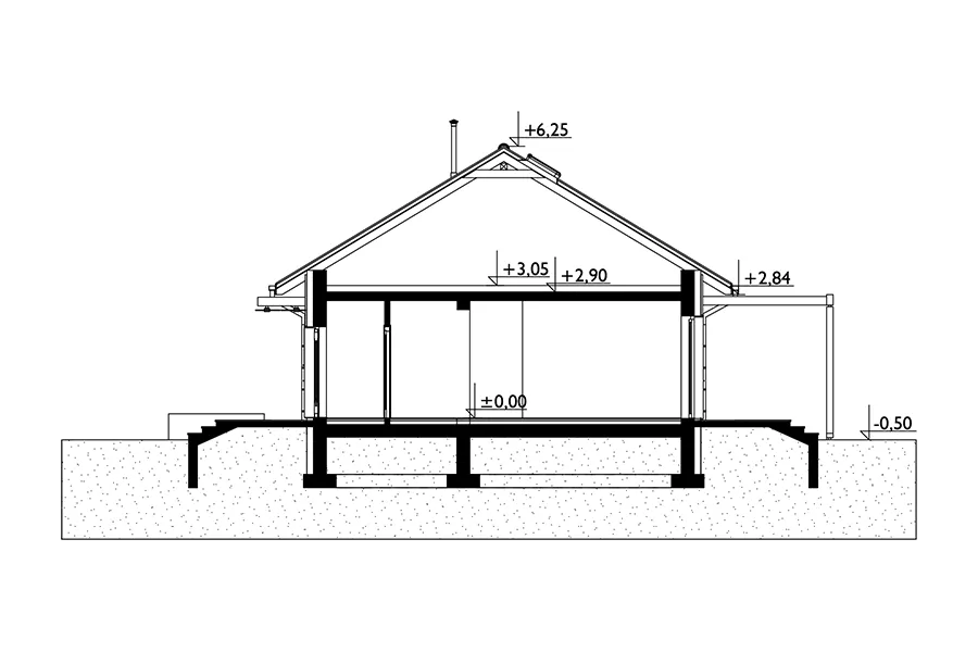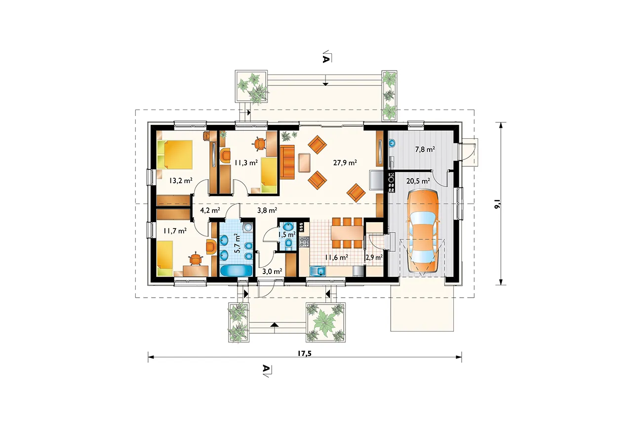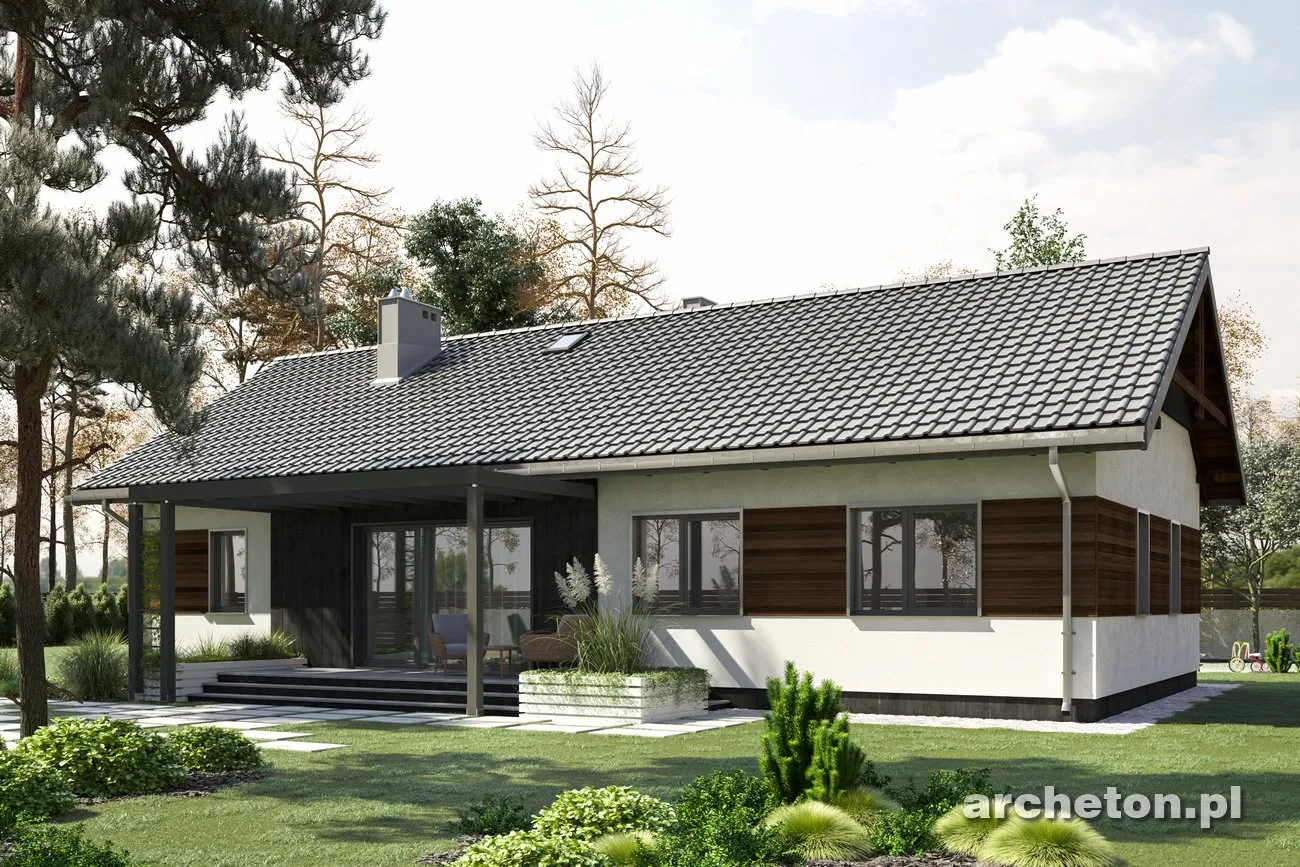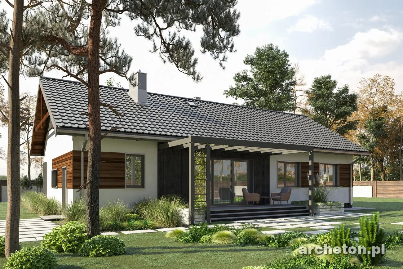 Проект одноэтажного дома «Бытомир» включает в себя большой встроенный гараж. Он имеет самую простую крышу и наиболее компактную прямоугольную планировку среди домов этого типа и размера. Визуально привлекательное сочетание квартиры и подсобных помещений в этом проекте представляет собой особую сложность, поскольку длинные стены, выходящие на фасад и сад, однородны (в отличие от аналогичного дома «Ламберт»). Гаражная секция с большой котельной расположена на одном уровне с жилой зоной, создавая высокоэнергоэффективную форму. Визуализация предлагает разделить основные фасады на секции с различными визуальными особенностями. Акцентирование центральной плоскости вокруг входной двери цветом, текстурой и деталями навеса визуально укорачивает фасад. Застекленная гостиная и терраса с перголой аналогично акцентированы со стороны сада. Проект дома «Бытомир», как и в доме «Ламберт», предлагает семье из четырех человек гостиную открытой планировки с камином, кухню с кладовой и выходом в гараж. Гостиная в доме «Бытомир», примыкающая к гаражу, освещается окнами с двух сторон. Рядом со второй, открытой фронтонной стеной расположены три спальни и большая ванная комната.