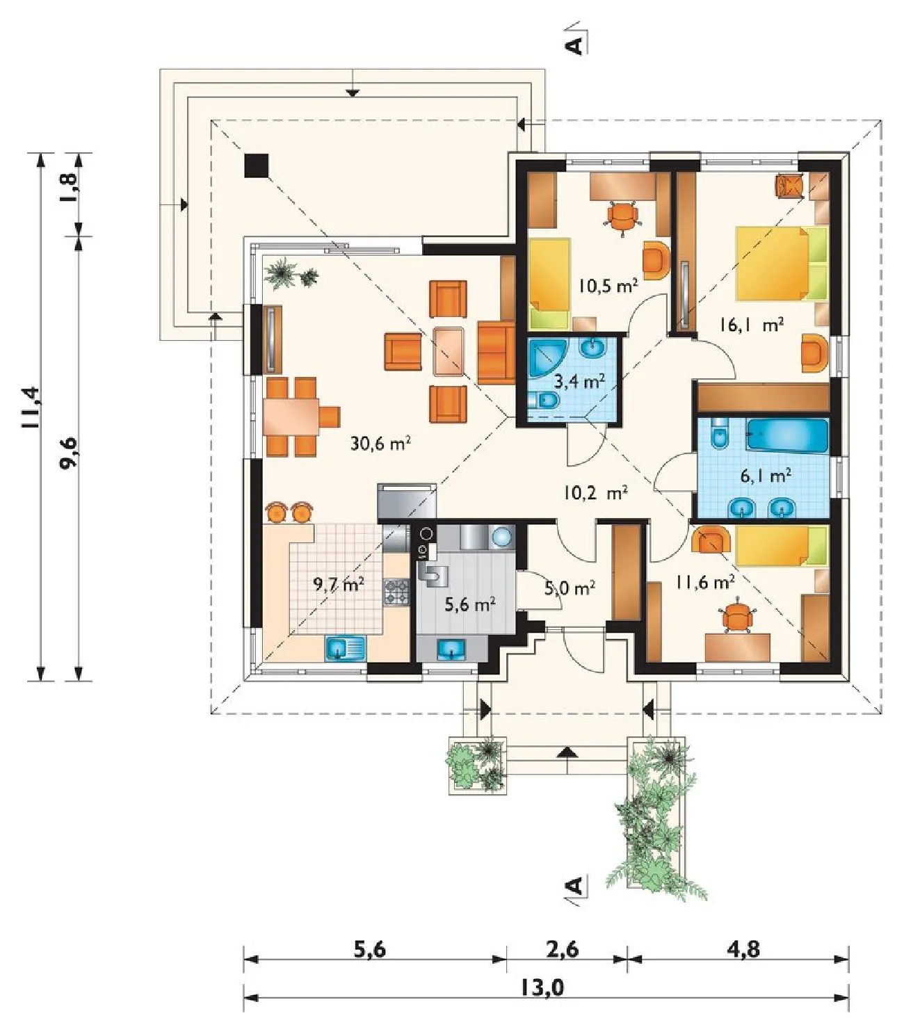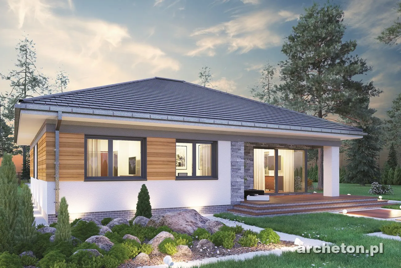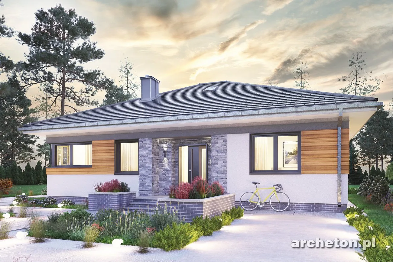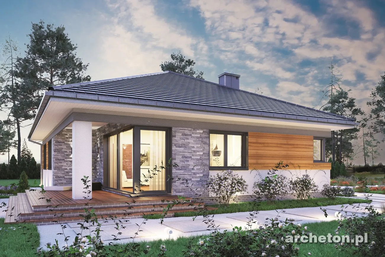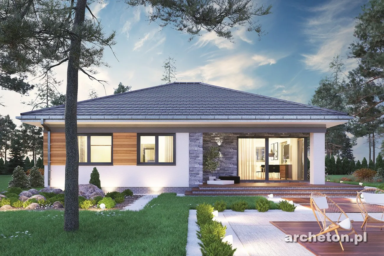 Описание проекта Квадра (1608) - компактный одноэтажный дом без гаража. Проект дома Kwadra был разработан для инвесторов, ищущих комфортабельный одноэтажный дом в более экономичном и компактном варианте, без гаража . Дом площадью 103 м² имеет функциональную четырехкомнатную планировку, сочетающую комфорт и простоту в элегантной конструкции с вальмовой крышей . Что делает проект Квадра уникальным? Представительный характер дома подчеркивается расположенным по центру нишевым входом, а угловое остекление гостиной добавляет легкости и открывает интерьер в сторону сада. Планировка спален использует различную площадь, что обеспечивает дому гибкость и возможность адаптации. Функциональная планировка помещения Интерьер разделен на две зоны, доступ к которым осуществляется из центрального коридора. Слева от входа расположена гостиная открытой планировки, совмещенная с кухней, являющаяся сердцем дома и располагающая к совместному времяпрепровождению. Из холла можно попасть в котельную, где также находятся прачечная и подсобное помещение. В приватной зоне расположены три спальни и две ванные комнаты – главная и дополнительная – что обеспечивает удобство повседневного использования. Меньшая и большая спальни расположены со стороны сада. Уютная передняя спальня находится прямо у входа, что делает ее идеальной для кабинета или уединенной гостевой комнаты. Для кого предназначен проект в Квадре? Проект Kwadra — это предложение для инвесторов, ищущих небольшой одноэтажный дом с простой планировкой и продуманным расположением комнат, наполненный естественным светом. Это идеальный выбор для семей, которые ценят простоту, функциональность и вневременную архитектуру в более компактном исполнении, без гаража .