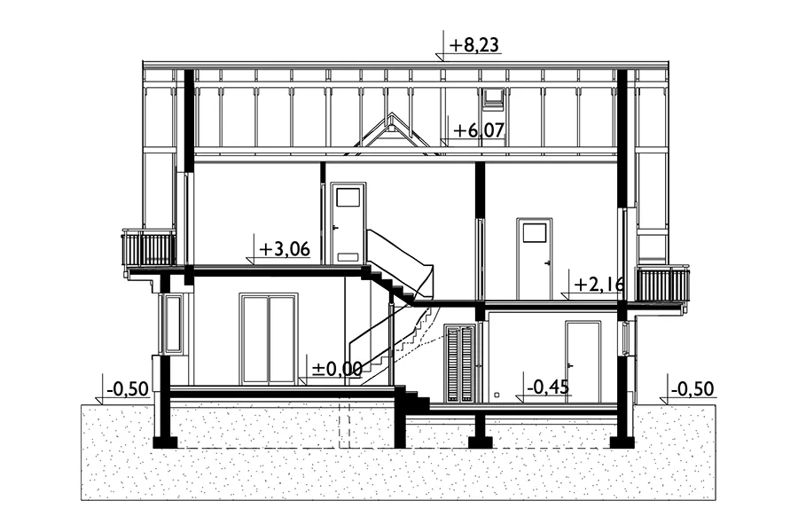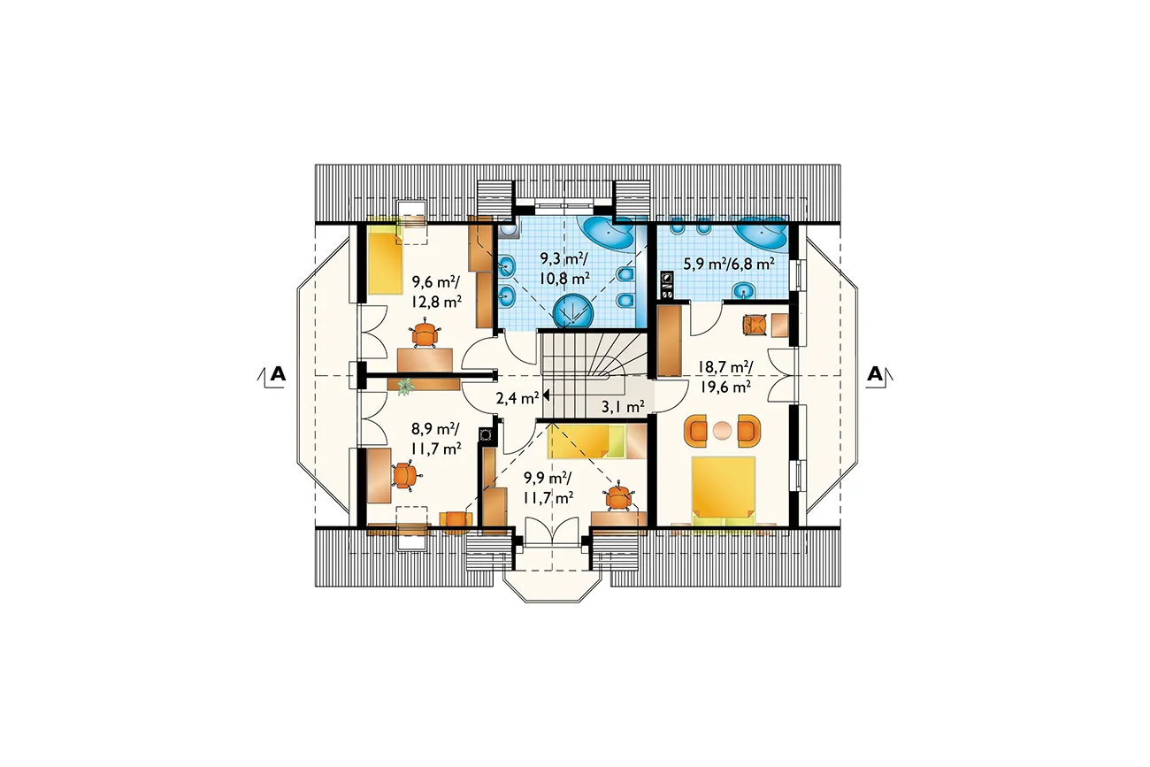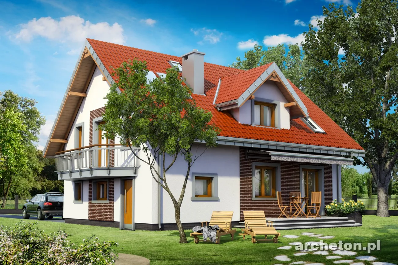 Дом с функциональным чердаком и подсобным помещением, примыкающим к боковой стене, является экономичным решением для частных инвесторов в жилищное строительство. К таким домам относятся проекты небольших и средних размеров: Zoja, Zofia и Helena, каждый с балконом на выступе фронтонной стены. Они используют пространство под двускатной крышей над обеими частями здания для создания ночной зоны с двумя ванными комнатами. Главная спальня отделена от четырех спален перепадом уровней. На первом этаже расположены гостиная с обеденной зоной, кухня и доступ в гараж и котельную. Проект дома Zofia Mini Eko — один из самых маленьких в семействе Zofia, но он уже предлагает дополнительную комнату рядом с гостиной и большую ванную комнату на первом этаже. Как и все версии с одним гаражом, здание имеет компактные очертания жилых и гаражных помещений и общую крышу. Симметричная конструкция мансардного окна с балконом над главным входом отличает его от Zoja и связывает с Helena. Проект дома Zofia Mini Eko, несмотря на меньшие масштабы, сохраняет детали, характерные для семейства Zofia: мансардные окна на обоих скатах и ​​декоративные балконы.
